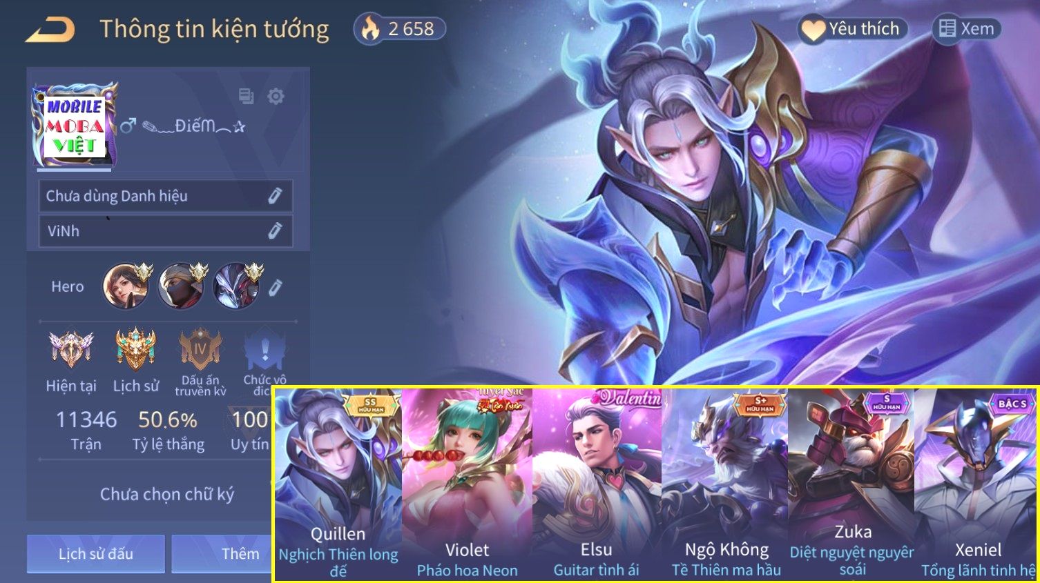 Nổi bật: Skin: Quillen Nghịch Thiên Long Đế×Violet Pháo Hoa Neon×Elsu Guitar Tình Ái×Xeniel Tống Lãnh Tinh Hệ×Zuka Diệt Nguyên Soái×