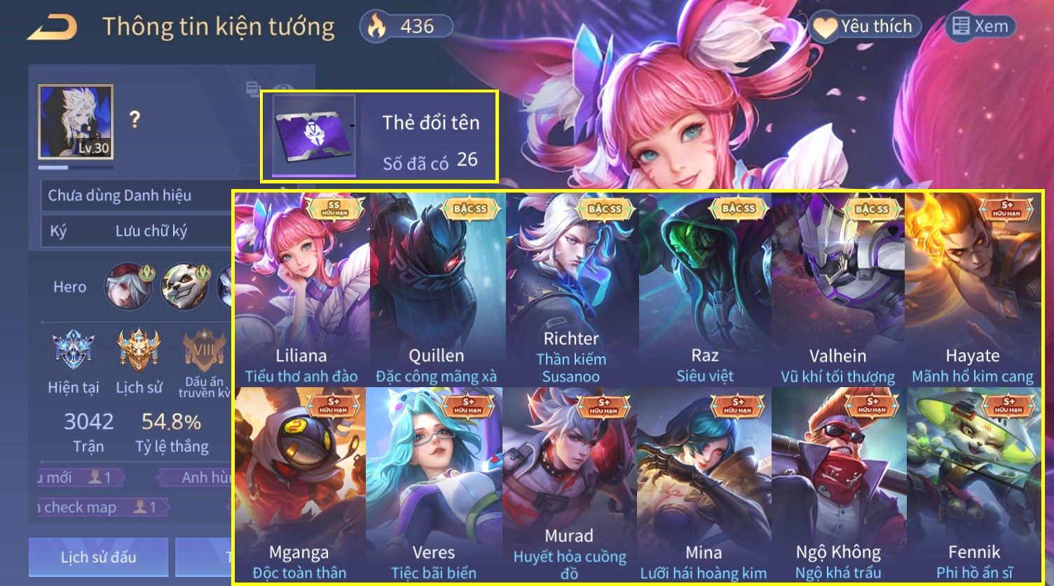 Nổi bật: Skin: Liliana Tiểu Thơ Anh Đào×Quillen Đặc Công Mãng Xà×Richter Thần Kiếm Susanoo×Raz Siêu Việt×Valhein Vũ Khí Tối Thượng×Full Ngọc, Nhiều Skin Đẹp