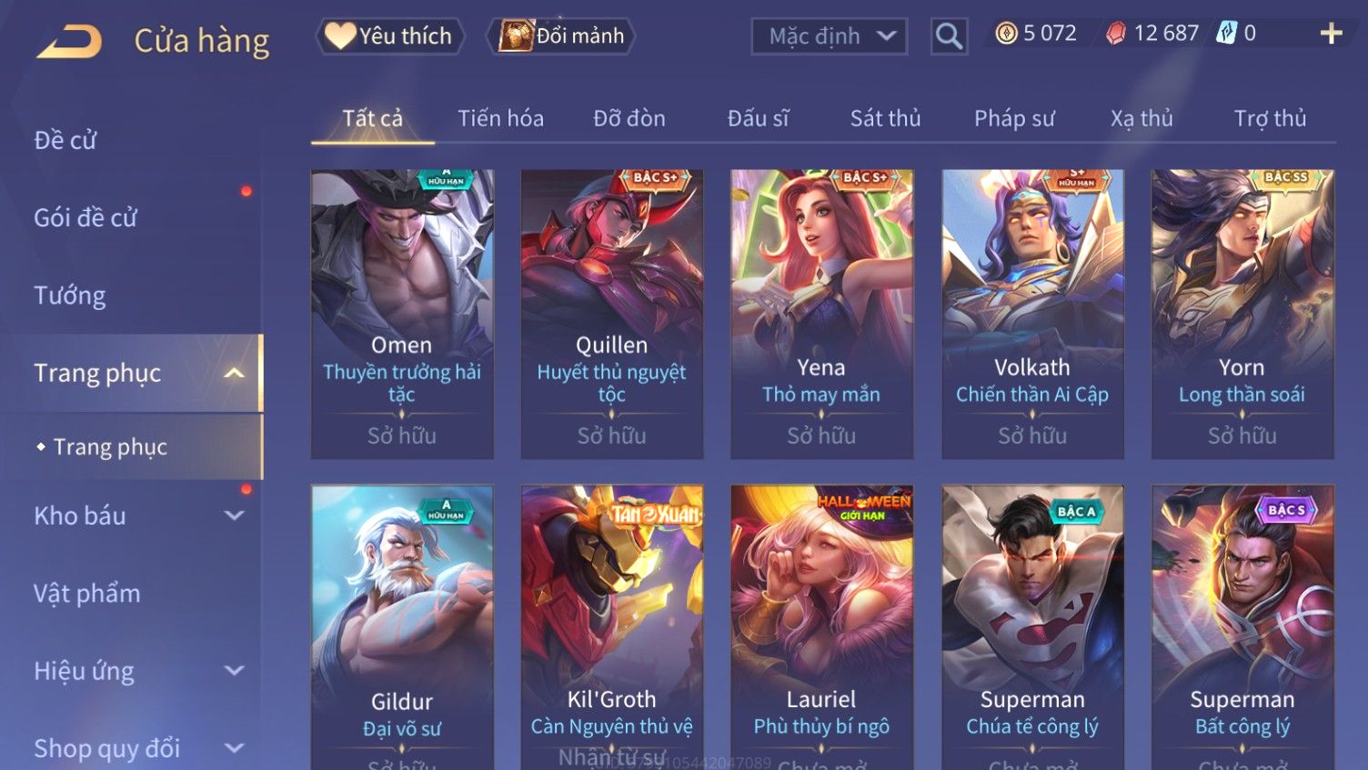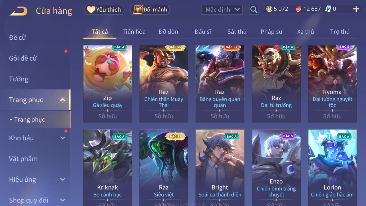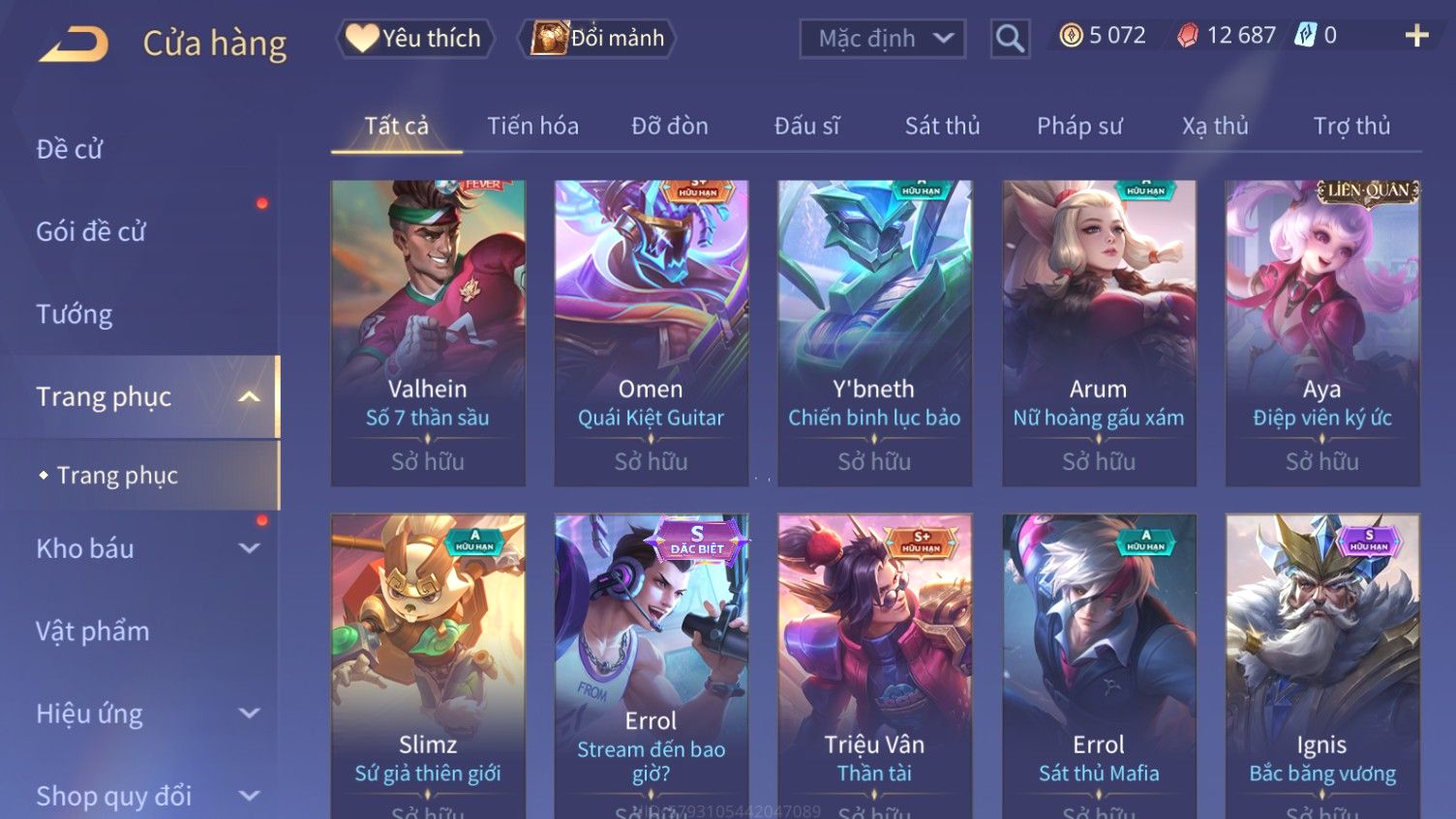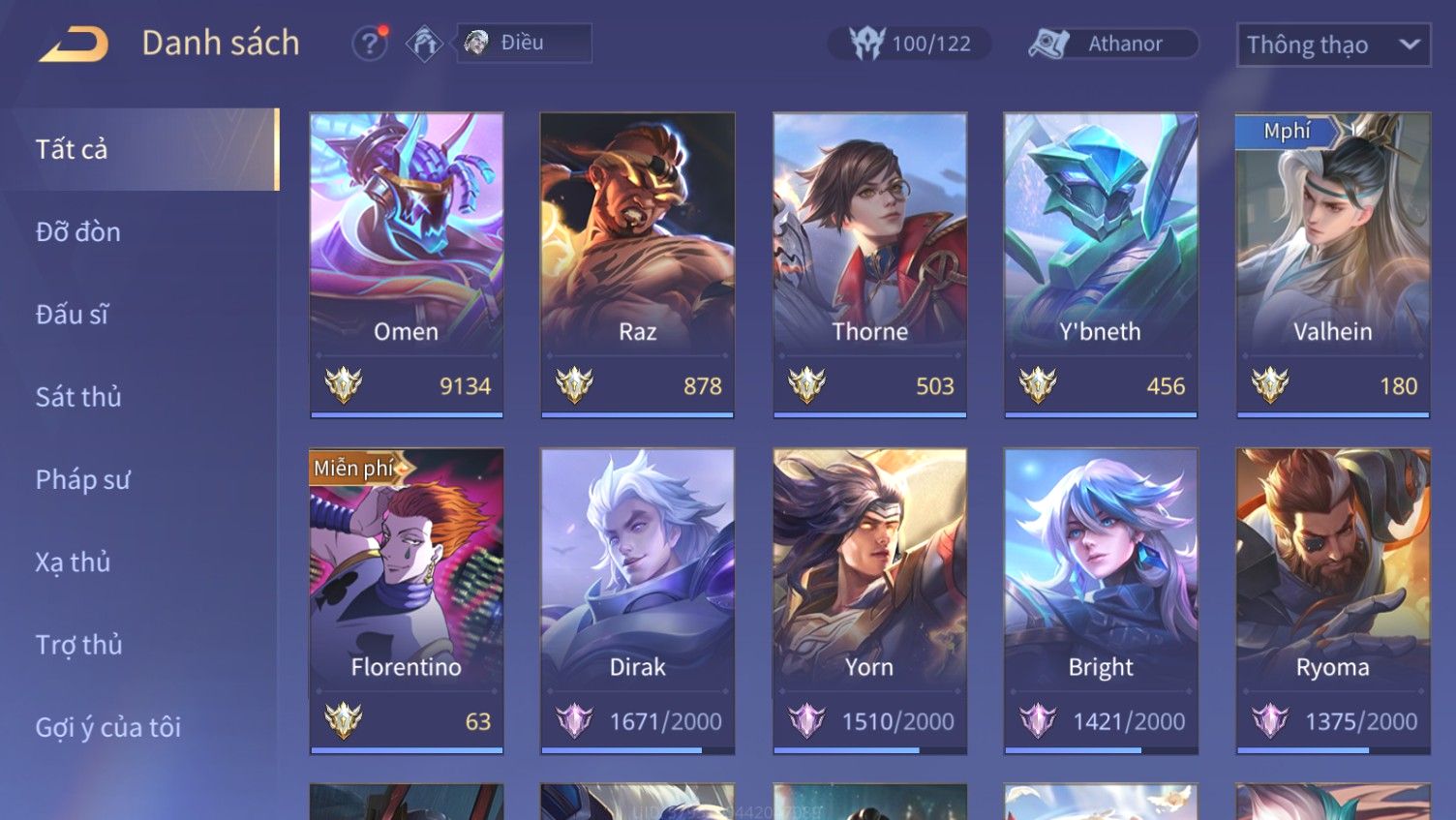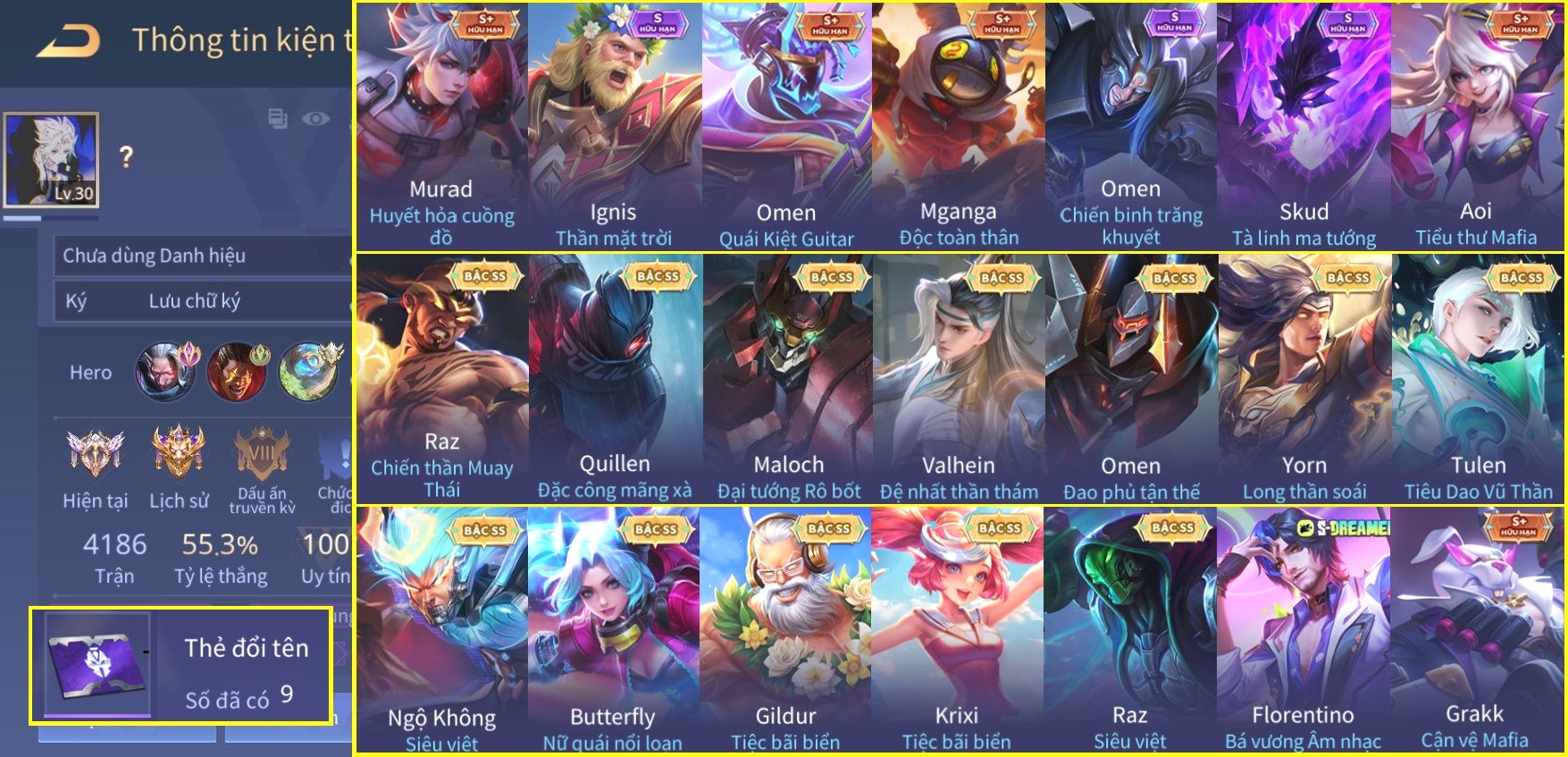 Nổi bật: Skin: Raz Chiến Thần Muay Thái×Quillen Đặc Công Mãng Xà×Maloch Đại Tướng Rô Bốt×Valhein Đệ Nhất Thần Thám×Omen Đao Phủ Tận Thế×Yorn Long Thần Soái×Tulen Tiêu Dao Vũ Thần×Ngộ Không Siêu Việt×Florentino Bá Vương Âm Nhạc×Full Ngọc, Nhiều Skin SS Đẹp