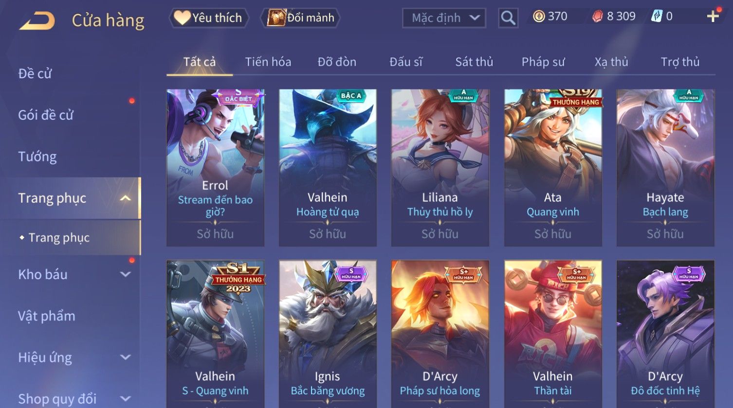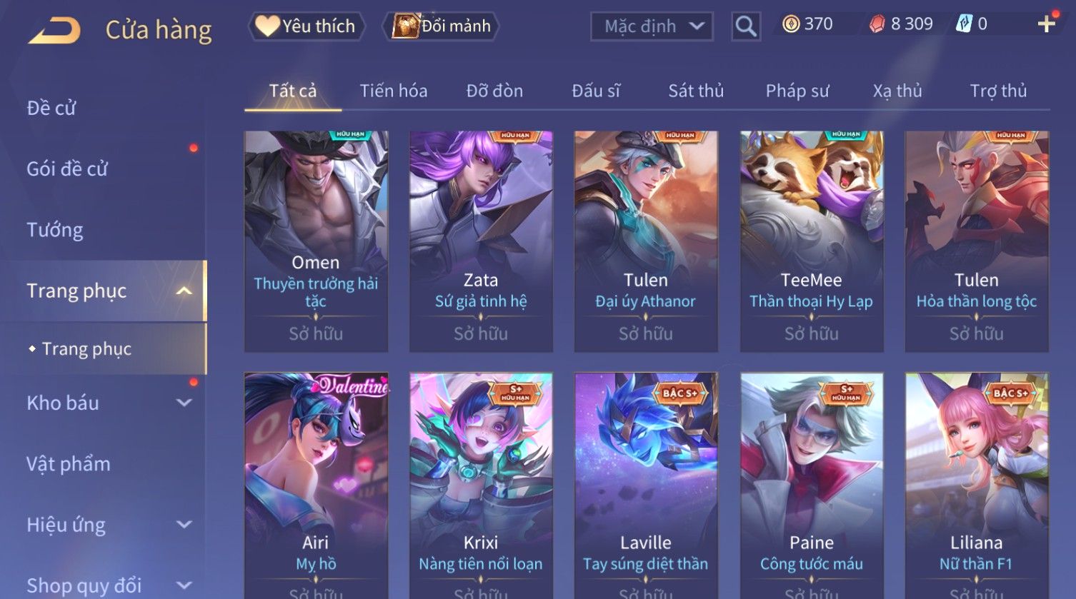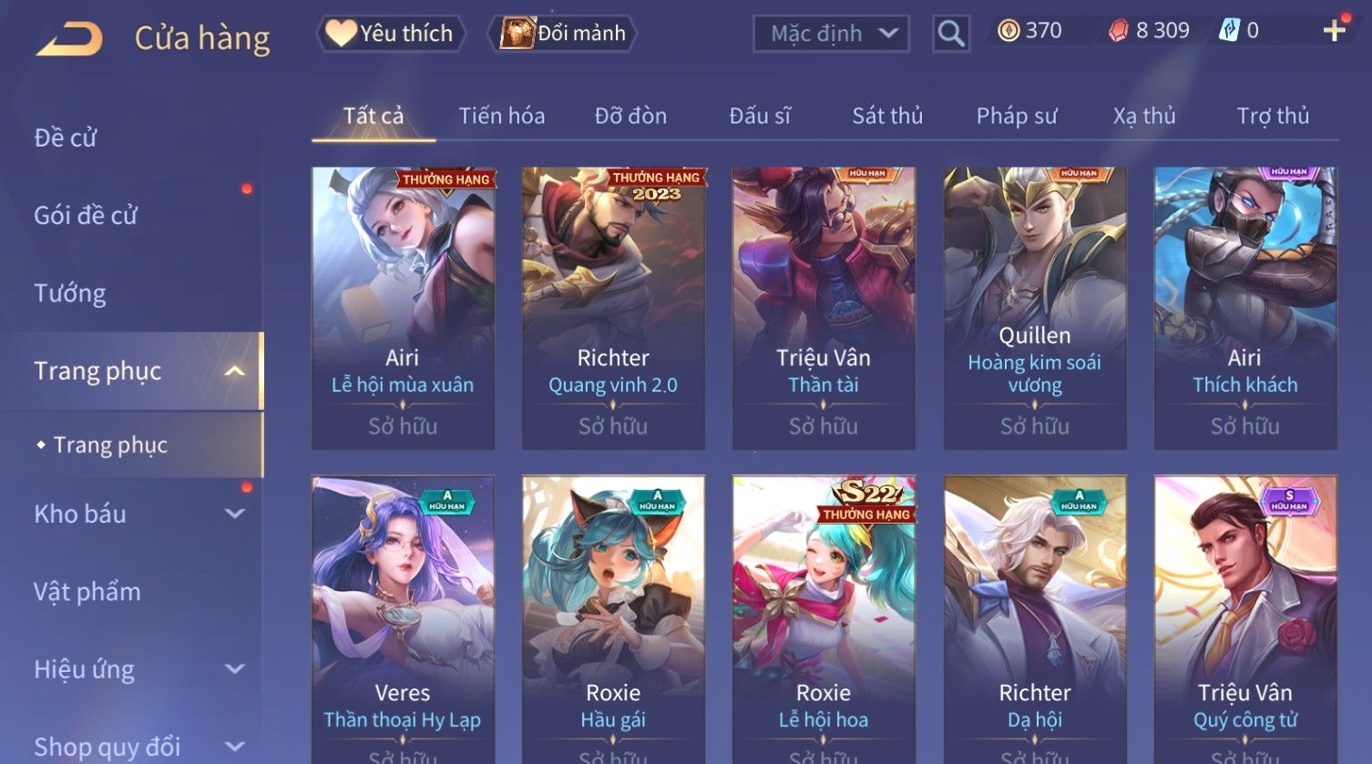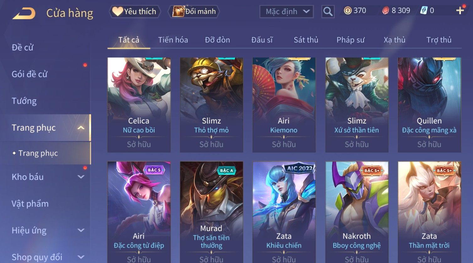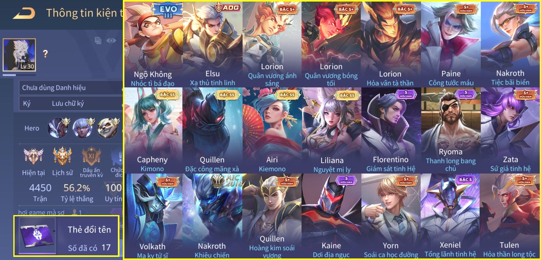 Nổi bật: Skin: Capheny Kimono×Quillen Đặc Công Mãng Xà×Airi Kiemono×Liliana Nguyệt Mị Ly×Florentino Giám Sát Tinh Hệ×Ryoma Thanh Long Bang Chủ×Zata Sứ Giả Tinh Hệ×Full Ngọc, Nhiều Skin SS Đẹp