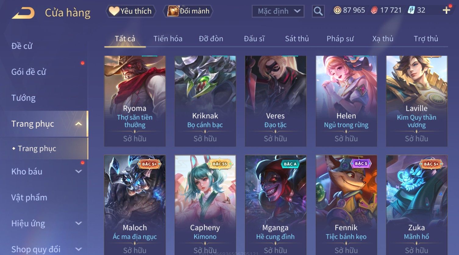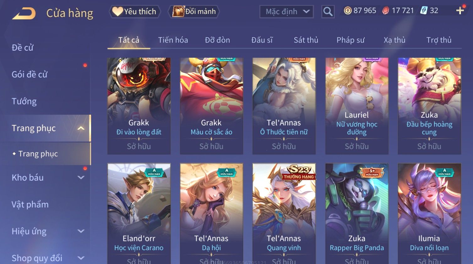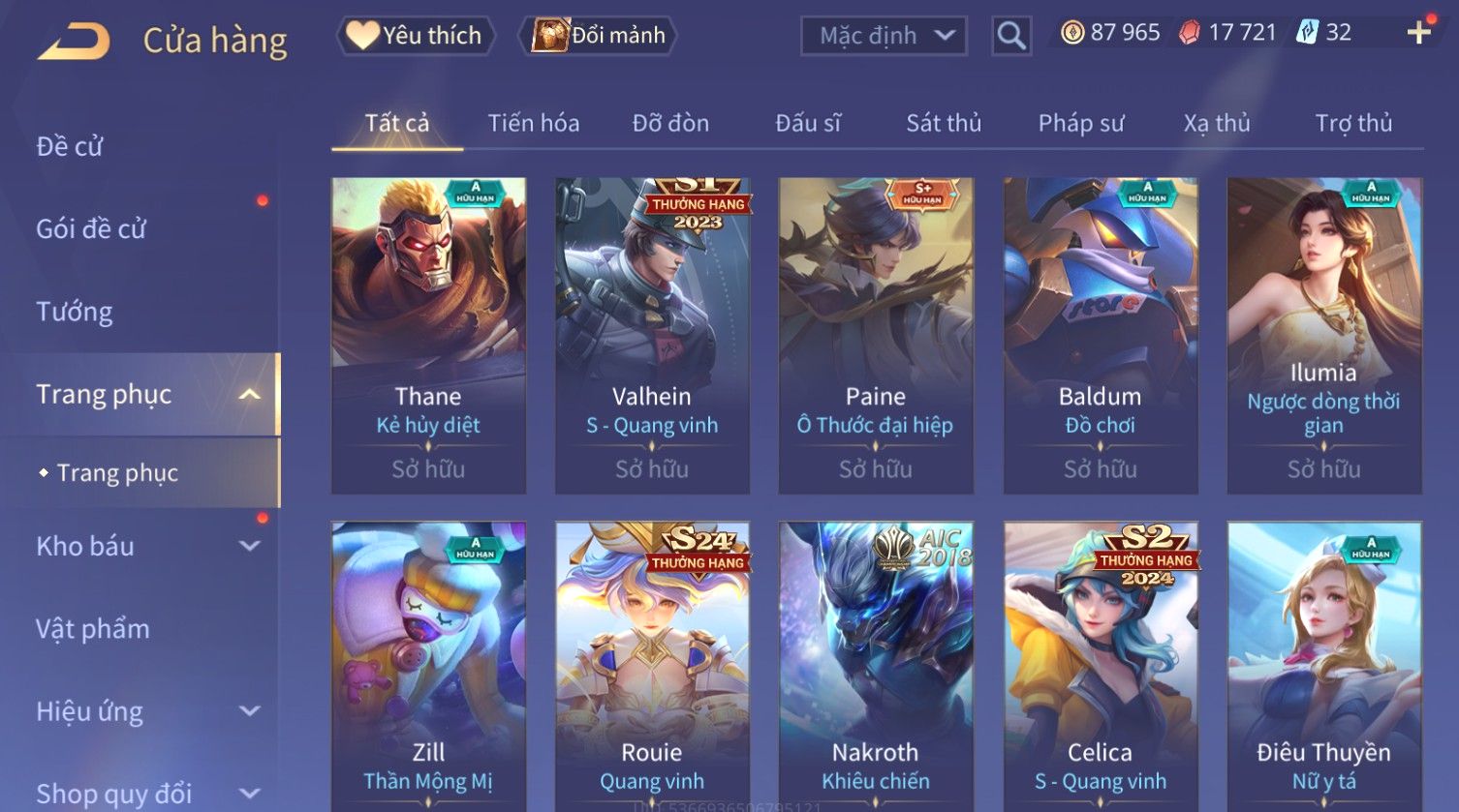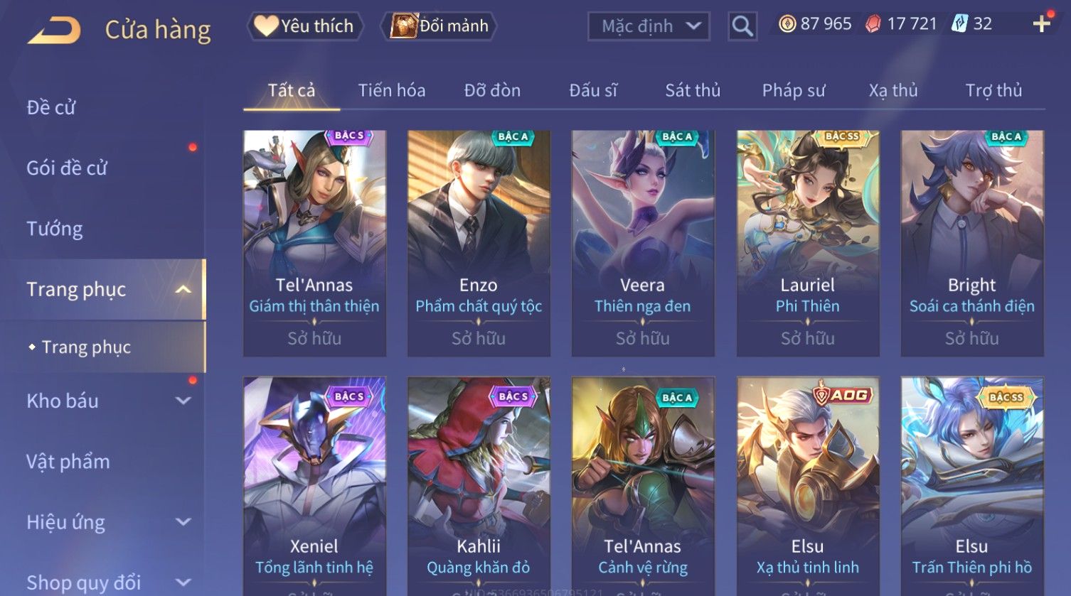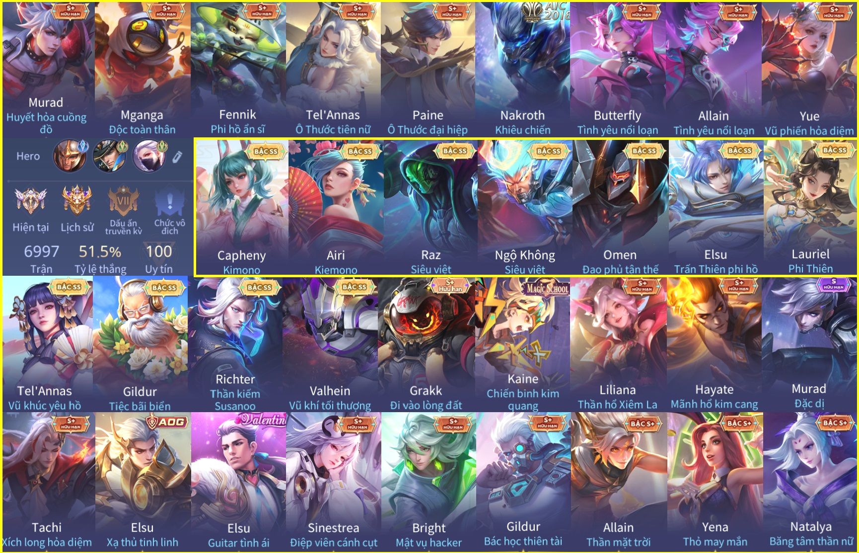 Nổi bật: Skin: Capheny Kimono×Airi Kiemono×Raz Siêu Việt×Ngộ Không Siêu Việt×Omen Đao Phủ Tận Thế×Elsu Trấn Thiên Phi Hồ×Lauriel Phi Thiên×Valhein Vũ Khí Tối Thượng×Tel'Annas Vũ Khúc Yêu Hồ×Richter Thần Kiếm Susanoo×Grakk Đi Vào Lòng Đất×Hayate Mãnh Hổ Kim Cang×Elsu Guitar Tình Ái×Full Ngọc, Nhiều Skin SS Đẹp