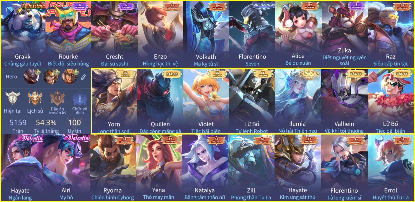 Nổi bật: Skin: Yorn Long Thần Soái×Quillen Đặc Công Mãng Xà×Lữ Bố Tư Lệnh Robot×Violet Tiệc Bãi Biển×Ilumia Nộ Hải Thiên Ngư×Full Ngọc, Nhiều Skin Đẹp