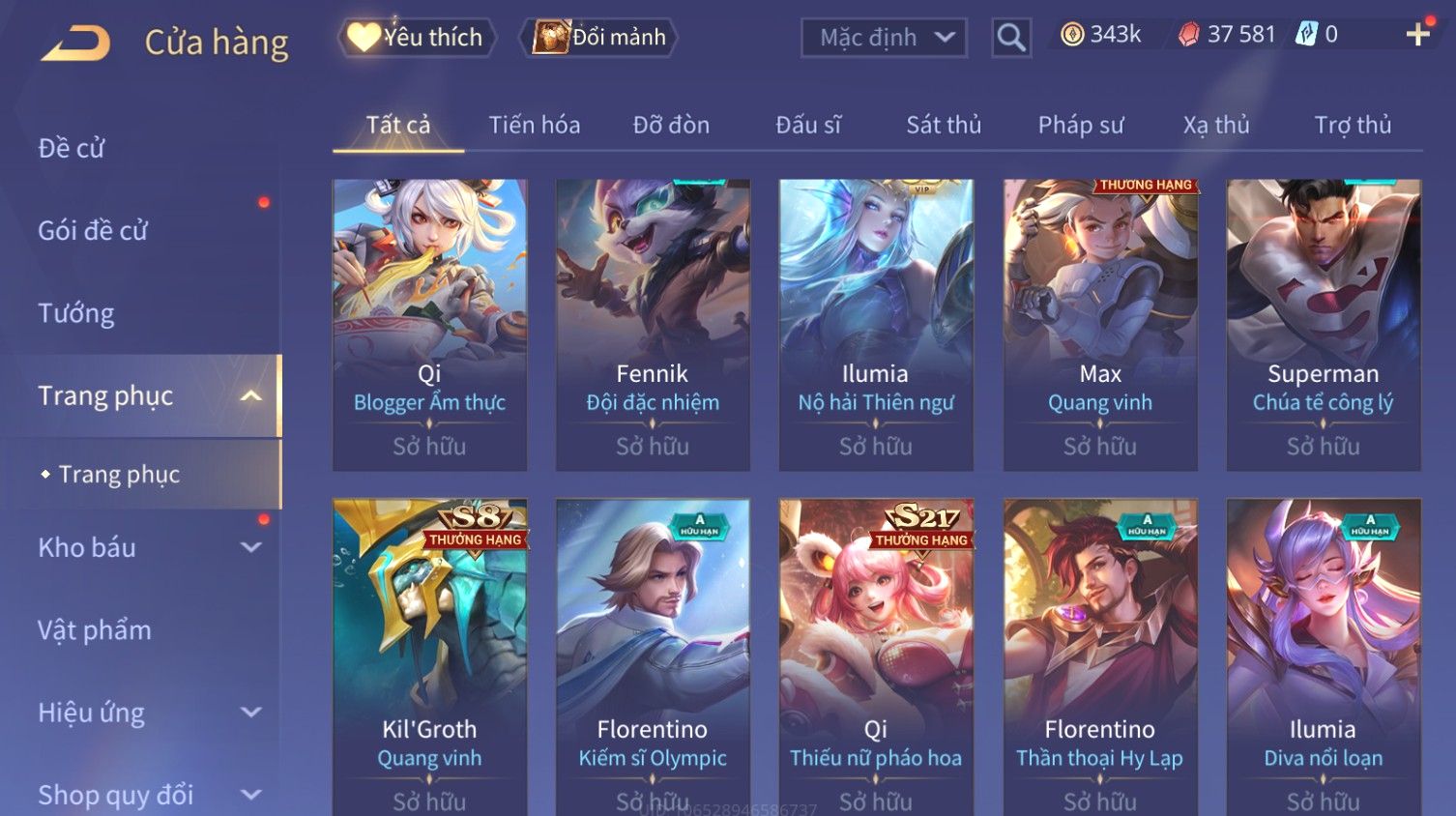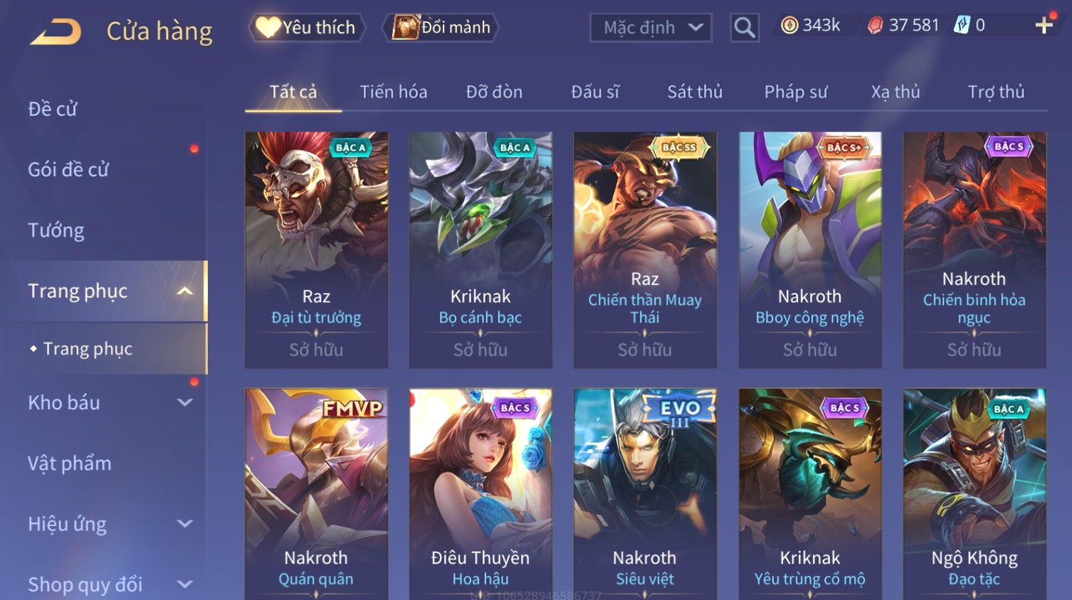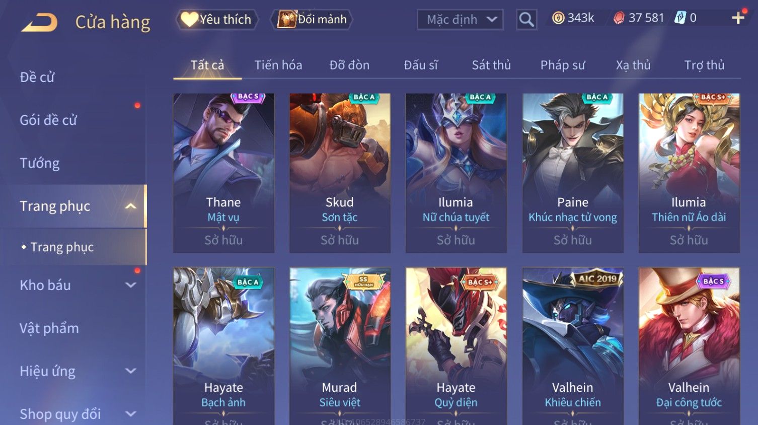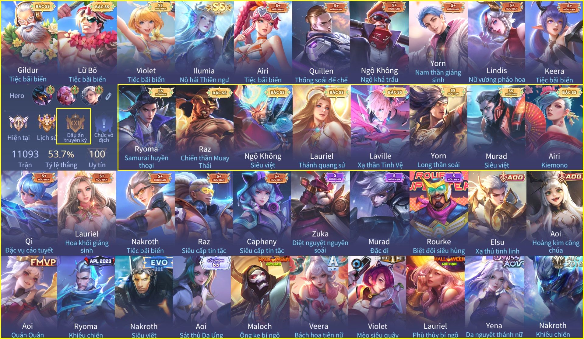 Nổi bật: Skin: Ryoma Sumarai Huyền Thoại×Raz Chiến Thần Muay Thái×Ngộ Không Siêu Việt×Lauriel Thánh Quang Sứ×Laville Xạ thần Tinh Vệ×Yorn Long Thần Soái×Murad Siêu Việt×Airi Kiemono×Ilumia Nộ Hải Thiên Ngư×Full Ngọc, Nhiều Skin SS Đẹp