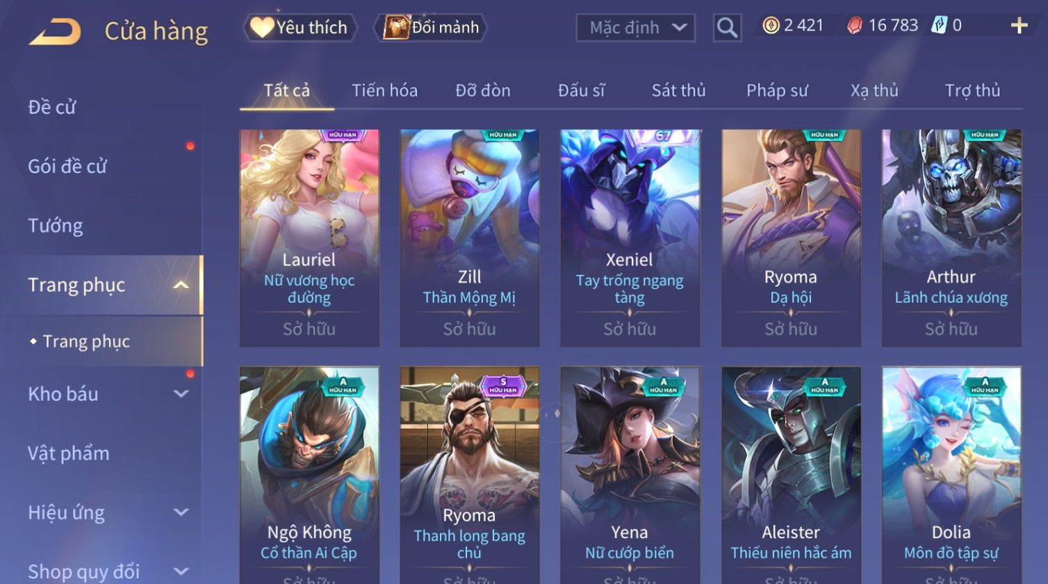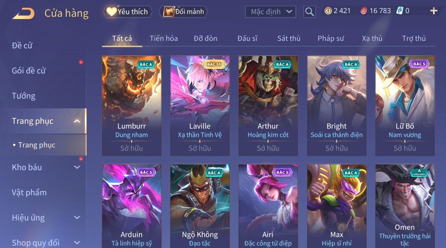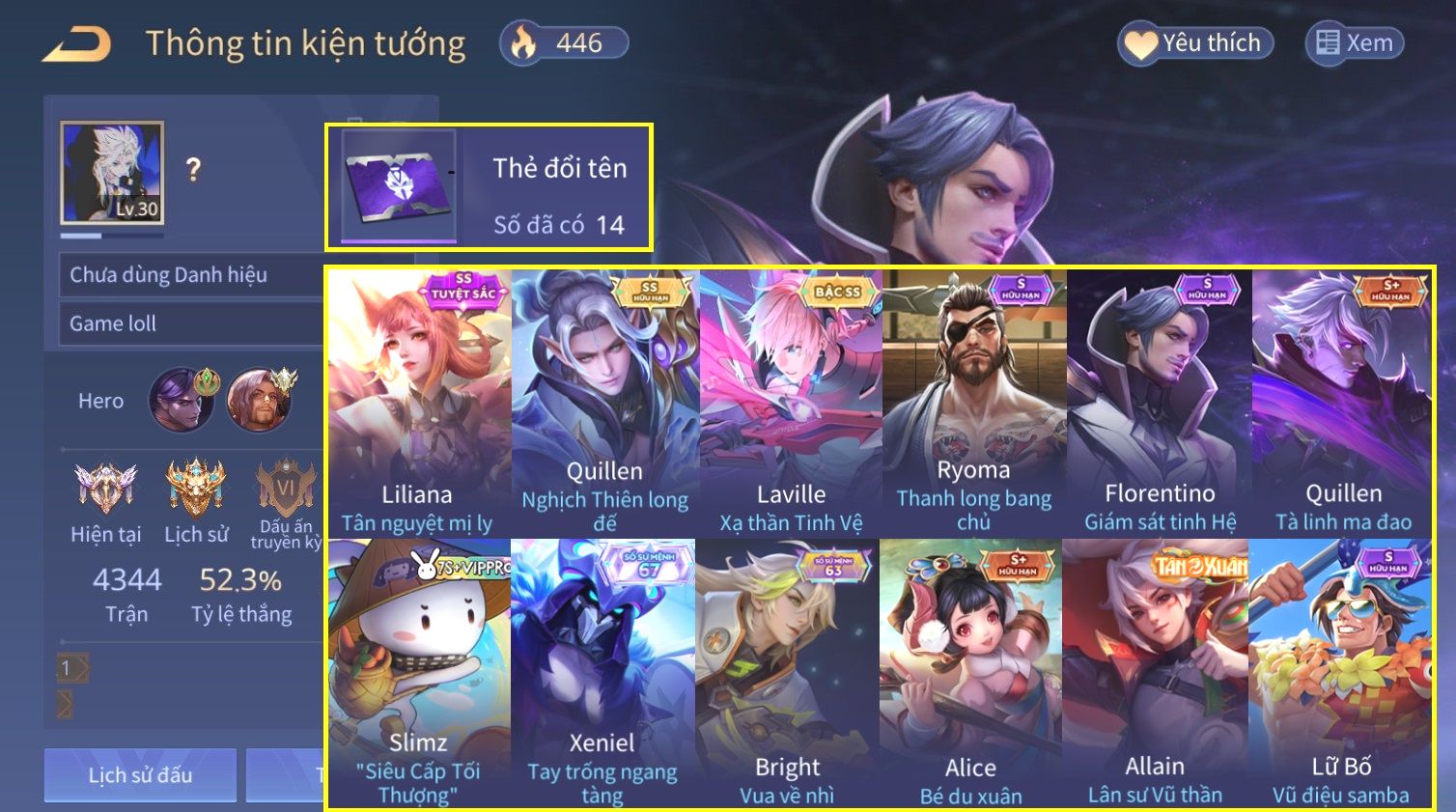 Nổi bật: Skin: Liliana Tân Nguyệt Mị Ly×Quillen Nghịch Thiên Long Đế×Laville Xạ thần Tinh Vệ×Florentino Giám Sát Tinh Hệ×Ryoma Thanh Long Bang Chủ×Full Ngọc, Nhiều Skin Đẹp