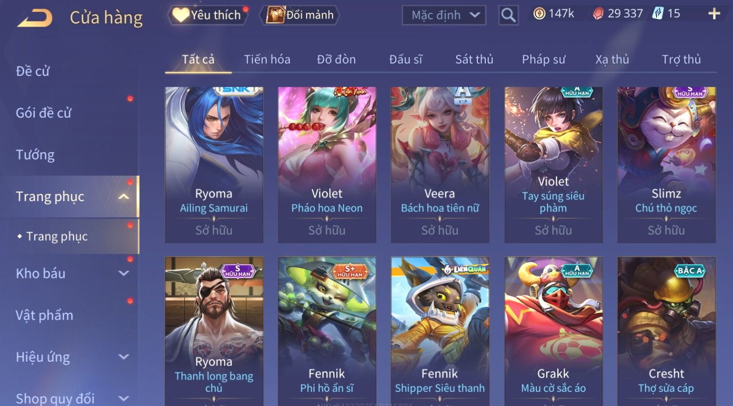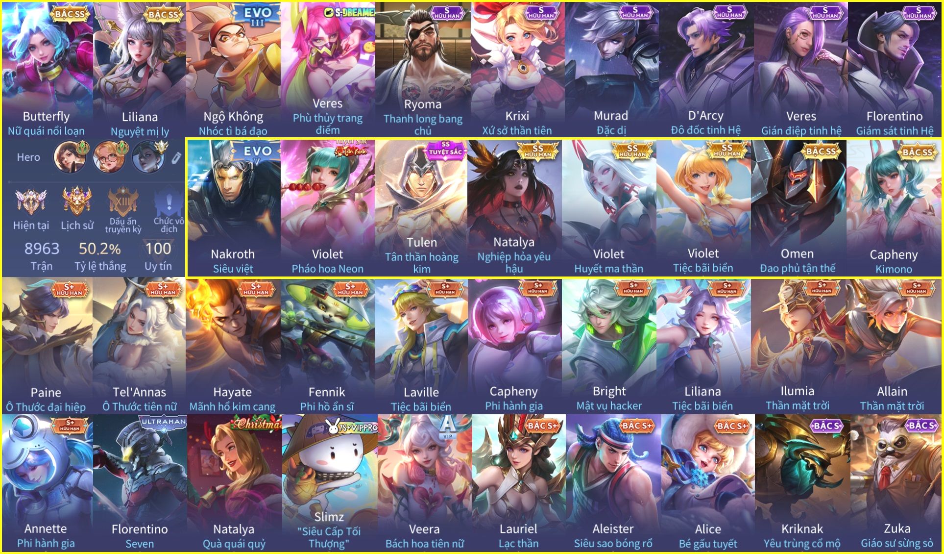 Nổi bật: Skin: Violet Pháo Hoa Neon×Tulen Tân Thần Hoàng Kim×Natalya Nghiệp Hỏa Yêu Hậu×Violet Huyết Ma Thần×Capheny Kimono×Omen Đao Phủ Tận Thế×Nakroth Siêu Việt×Florentino Giám Sát Tinh Hệ×Veres Gián Điệp Tinh Hệ×D'Arcy Đô Đốc Tinh Hệ×Murad Đặc Dị×Ryoma Thanh Long Bang Chủ×Full Ngọc, Nhiều Skin SS Đẹp