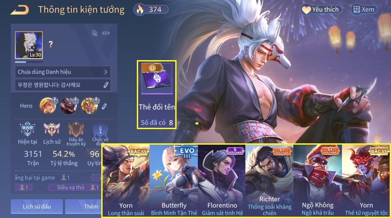 Nổi bật: Skin: Yorn Long Thần Soái×Florentino Giám Sát Tinh Hệ×Richter Thống Soái Kháng Chiến×Full Ngọc, Nhiều Skin Đẹp