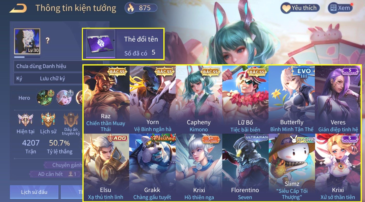 Nổi bật: Skin: Raz Chiến Thần Muay Thái×Yorn Vệ Binh Ngân Hà×Capheny Kimono×Florentino Seven×Full Ngọc, Nhiều Skin SS Đẹp