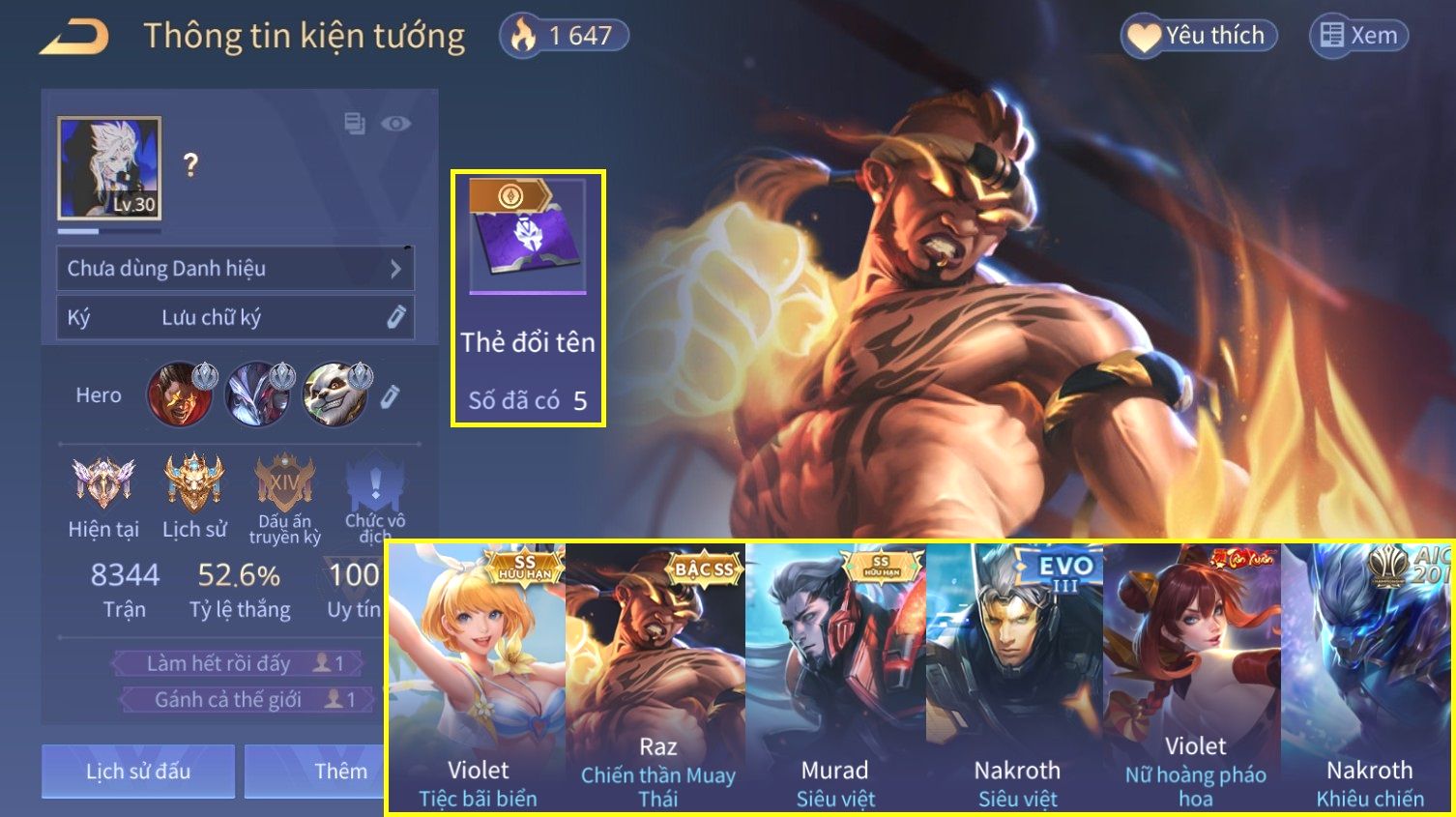 Nổi bật: Skin: Raz Chiến Thần Muay Thái×Violet Tiệc Bãi Biển×Murad Siêu Việt×Nakroth Siêu Việt×Violet Nữ Hoàng Pháo Hoa×Full Ngọc, Nhiều Skin SS Đẹp
