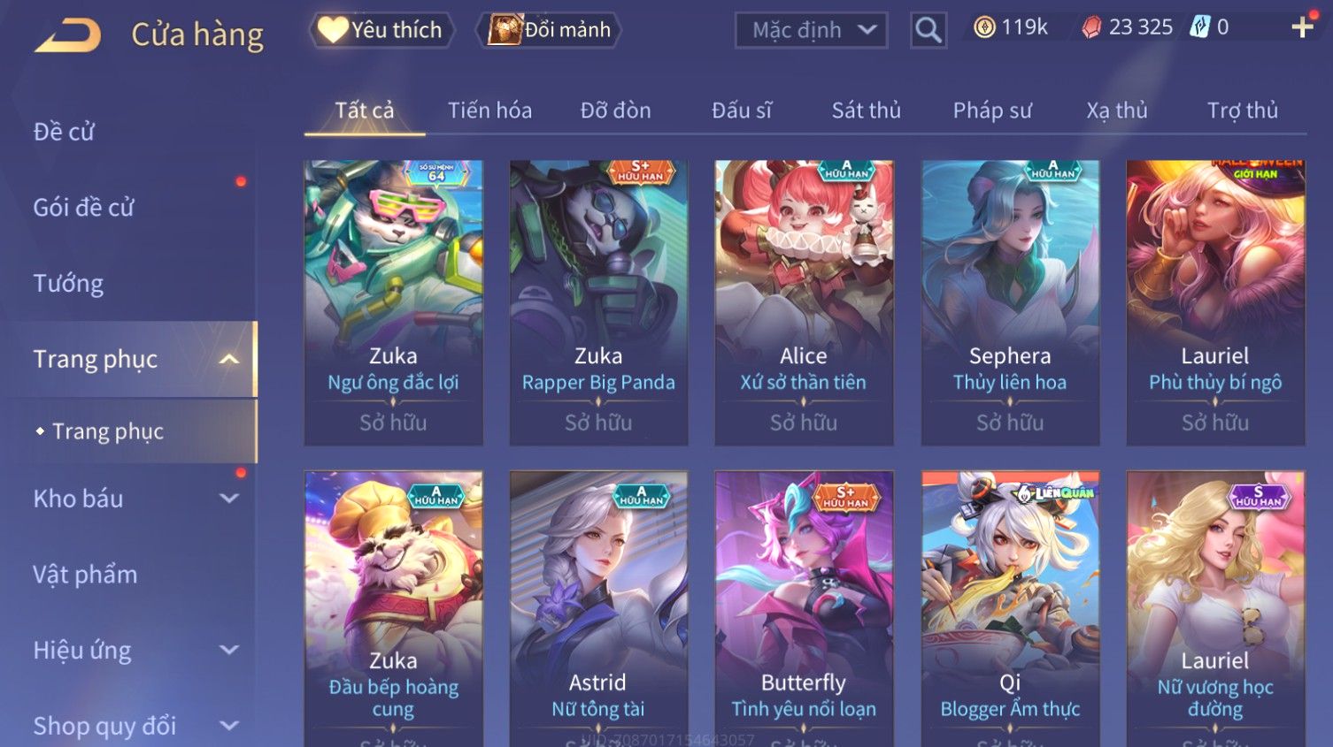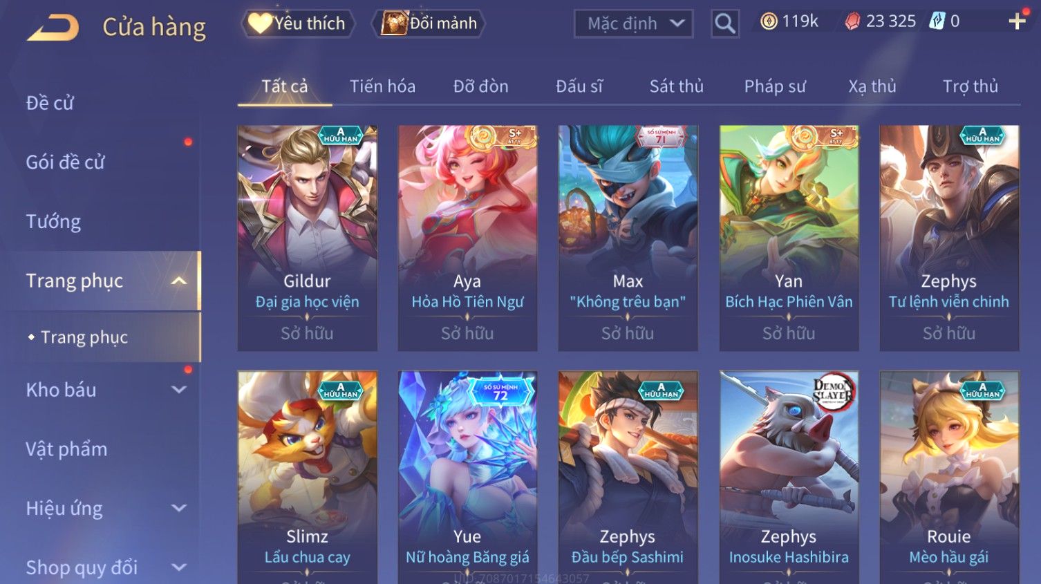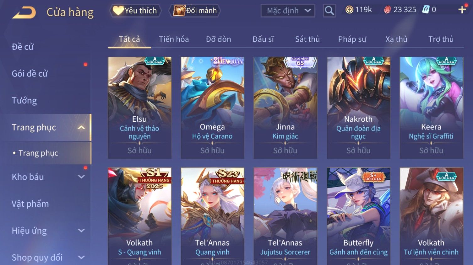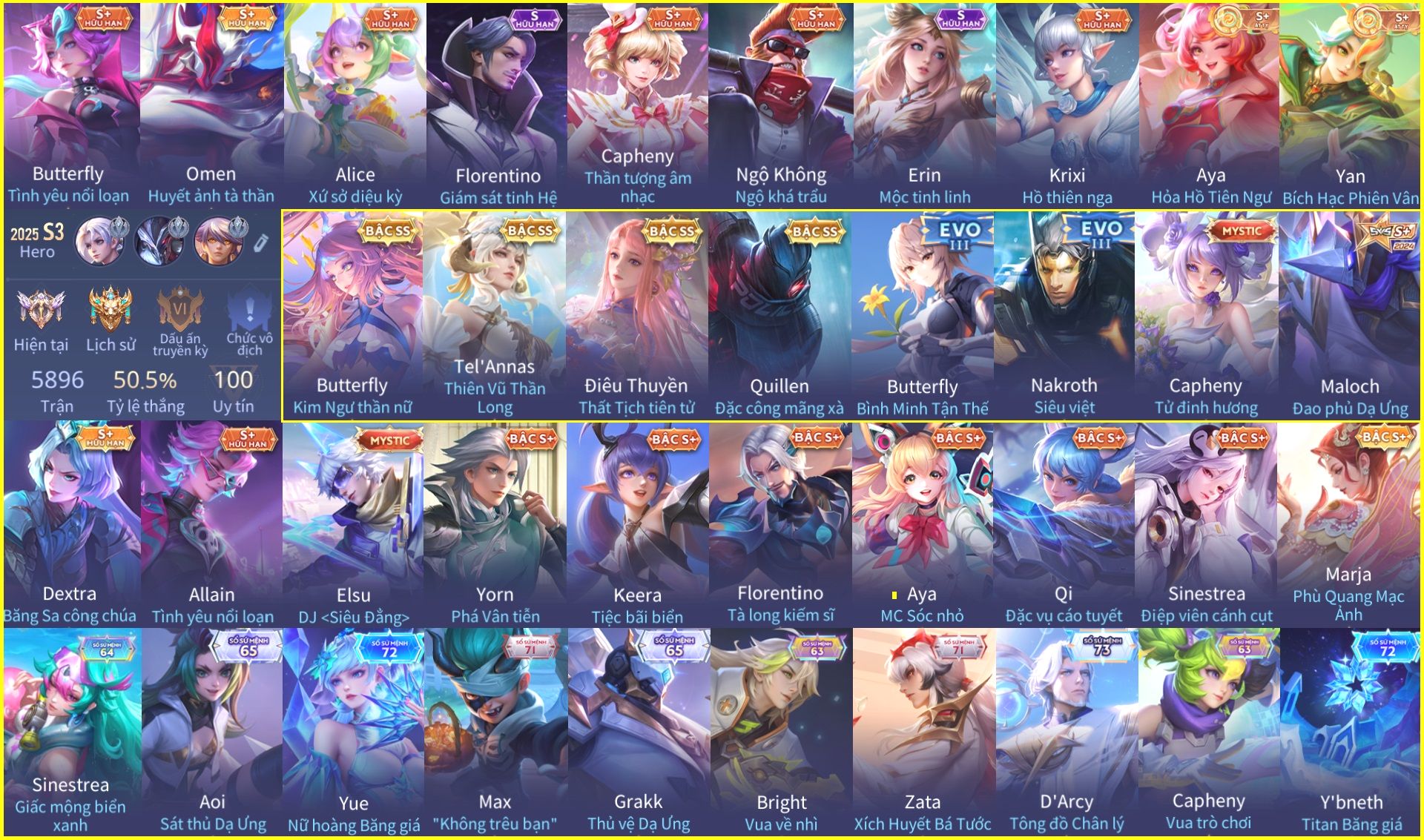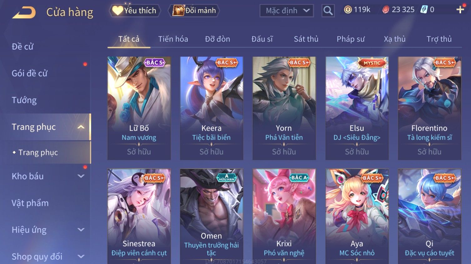 Nổi bật: Skin: Butterfly Kim Ngư Thần Nữ×Tel'Annas Thiên Vũ Thần Long×Điêu Thuyền Thất Tịch Tiên Tử×Quillen Đặc Công Mãng Xà×Capheny Tử Đinh Hương×Florentino Giám Sát Tinh Hệ×Aya Mc Sóc Nhỏ×Full Ngọc, Nhiều Skin SS Đẹp
