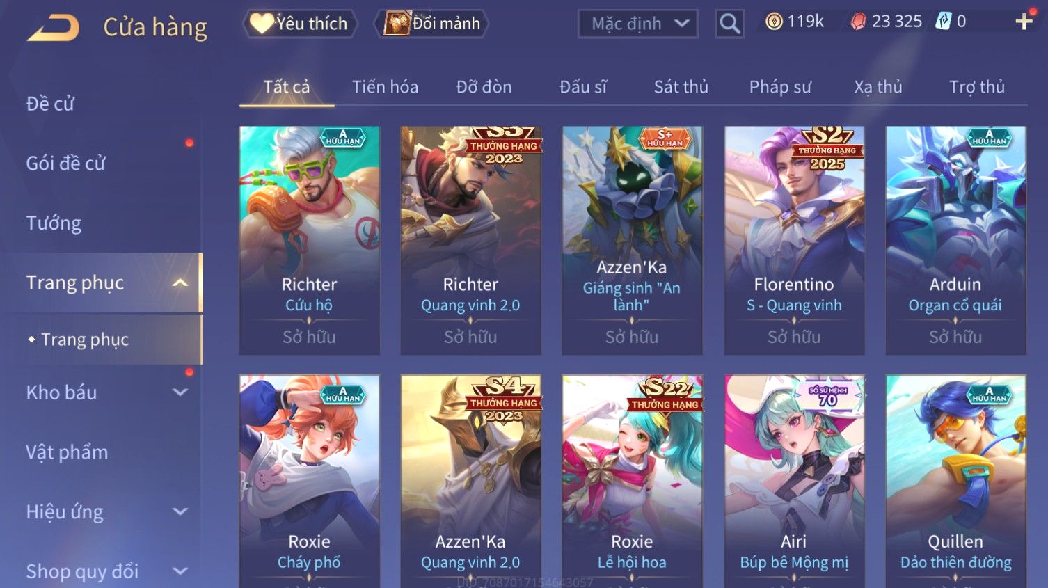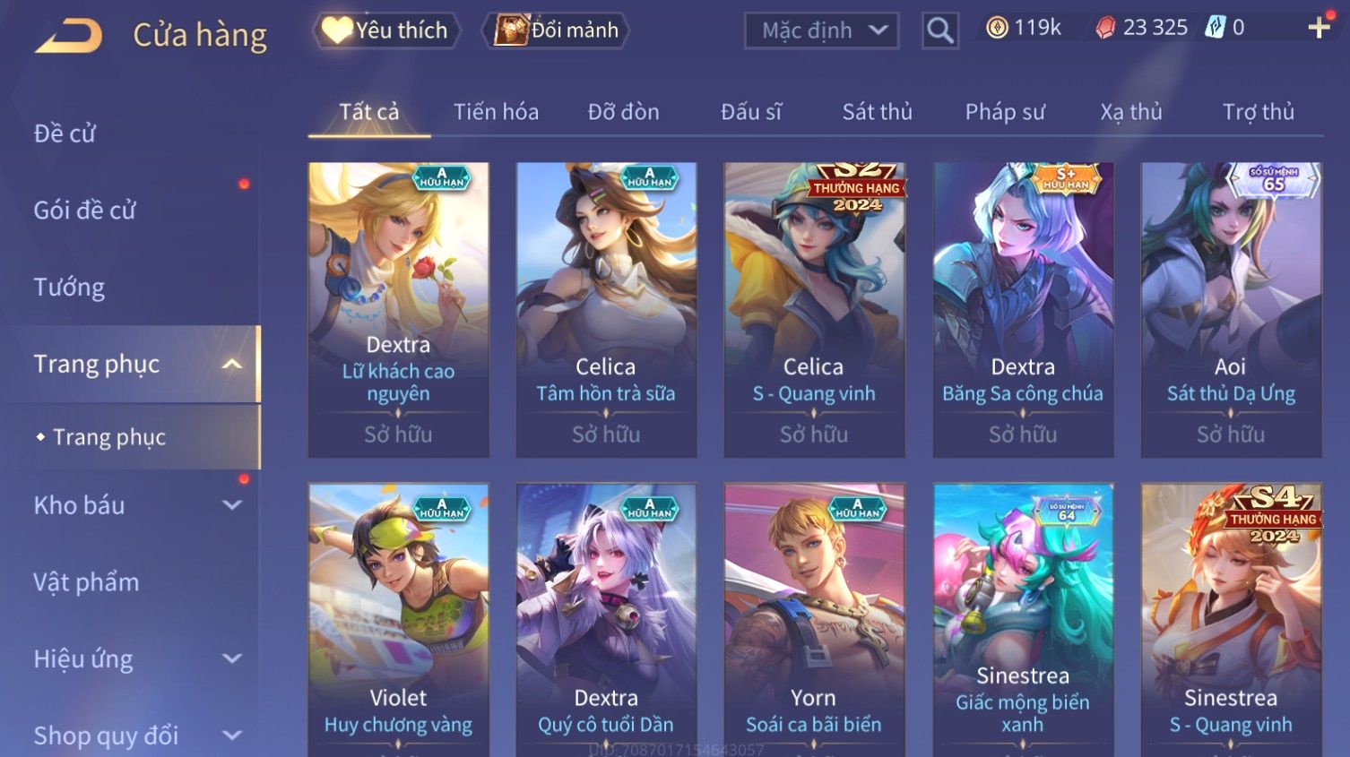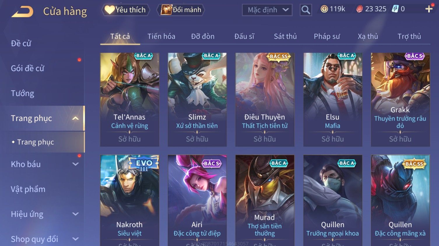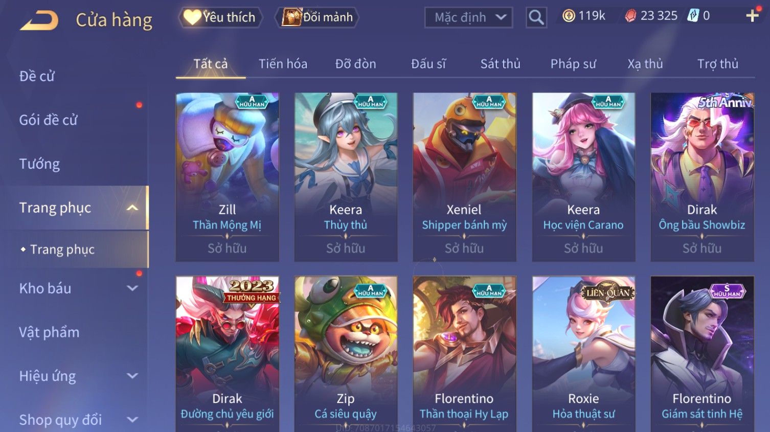 Nổi bật: Skin: Butterfly Kim Ngư Thần Nữ×Tel'Annas Thiên Vũ Thần Long×Điêu Thuyền Thất Tịch Tiên Tử×Quillen Đặc Công Mãng Xà×Capheny Tử Đinh Hương×Florentino Giám Sát Tinh Hệ×Aya Mc Sóc Nhỏ×Full Ngọc, Nhiều Skin SS Đẹp