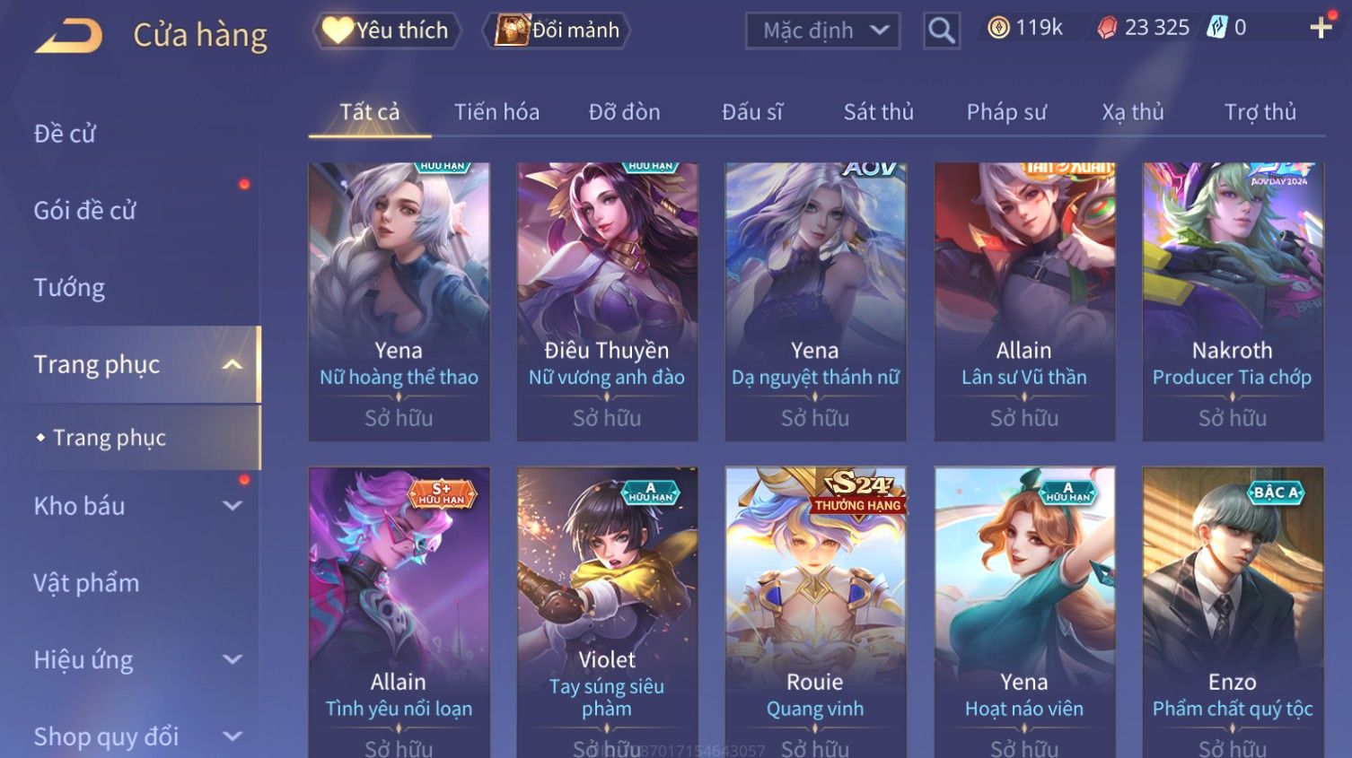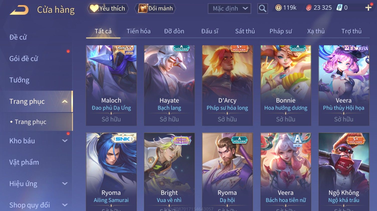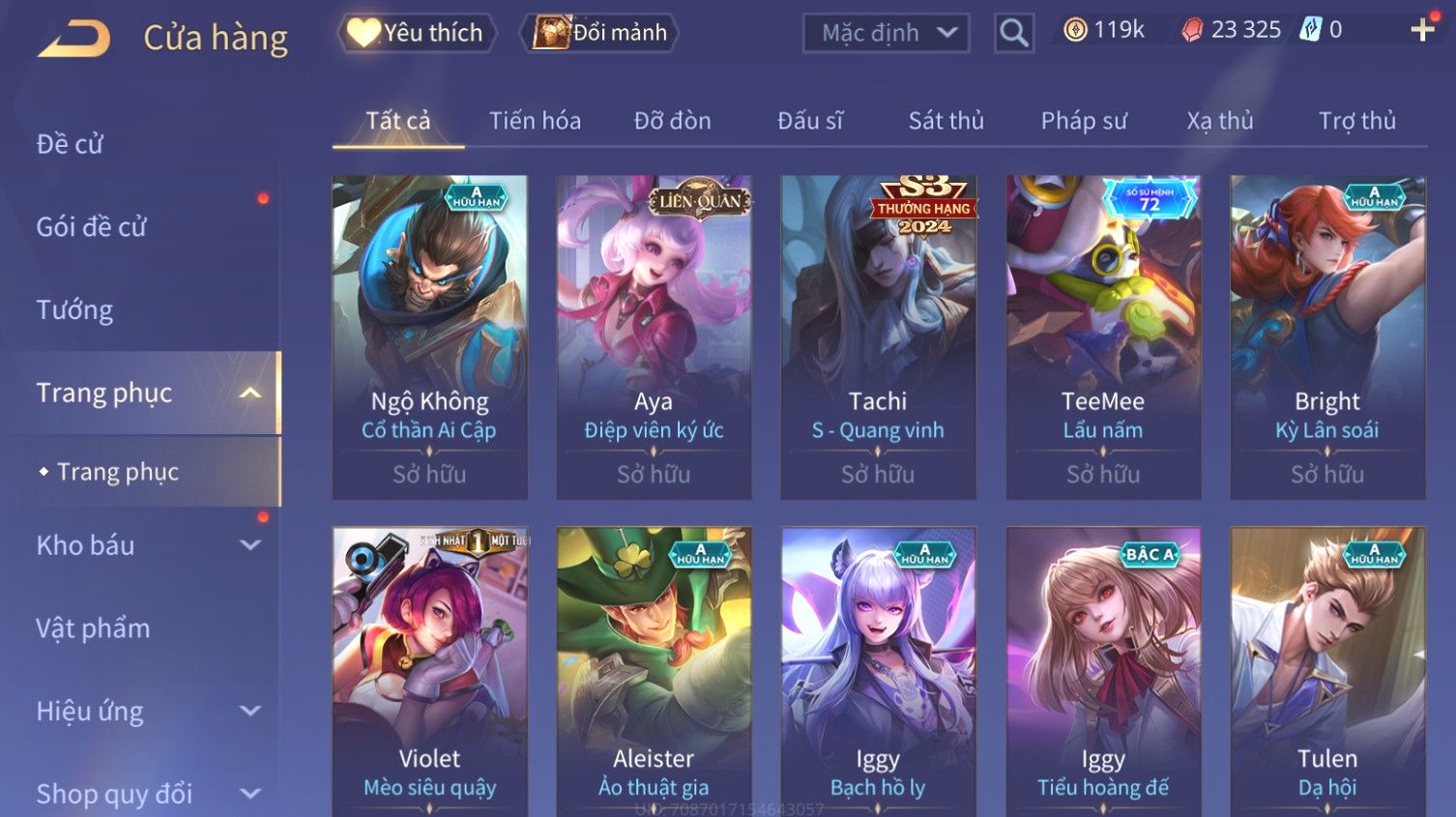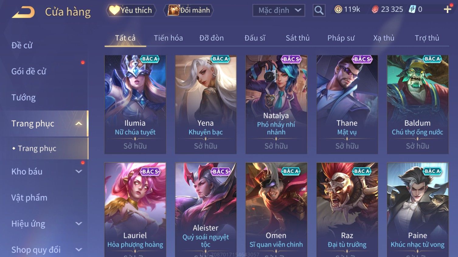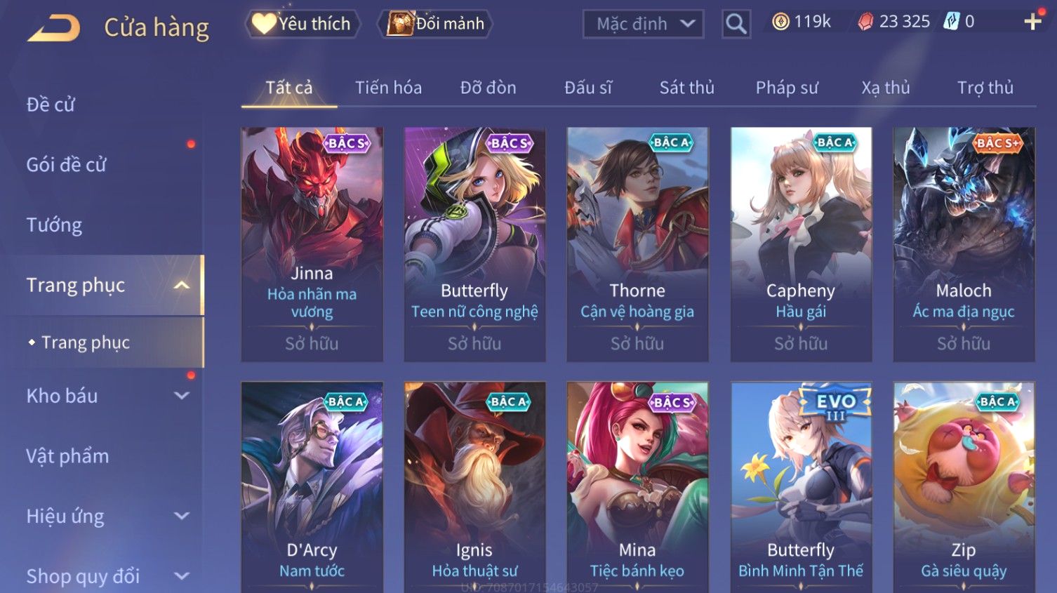 Nổi bật: Skin: Butterfly Kim Ngư Thần Nữ×Tel'Annas Thiên Vũ Thần Long×Điêu Thuyền Thất Tịch Tiên Tử×Quillen Đặc Công Mãng Xà×Capheny Tử Đinh Hương×Florentino Giám Sát Tinh Hệ×Aya Mc Sóc Nhỏ×Full Ngọc, Nhiều Skin SS Đẹp
