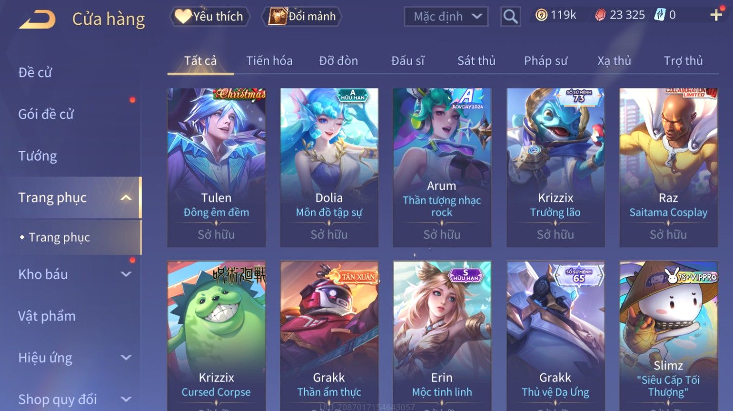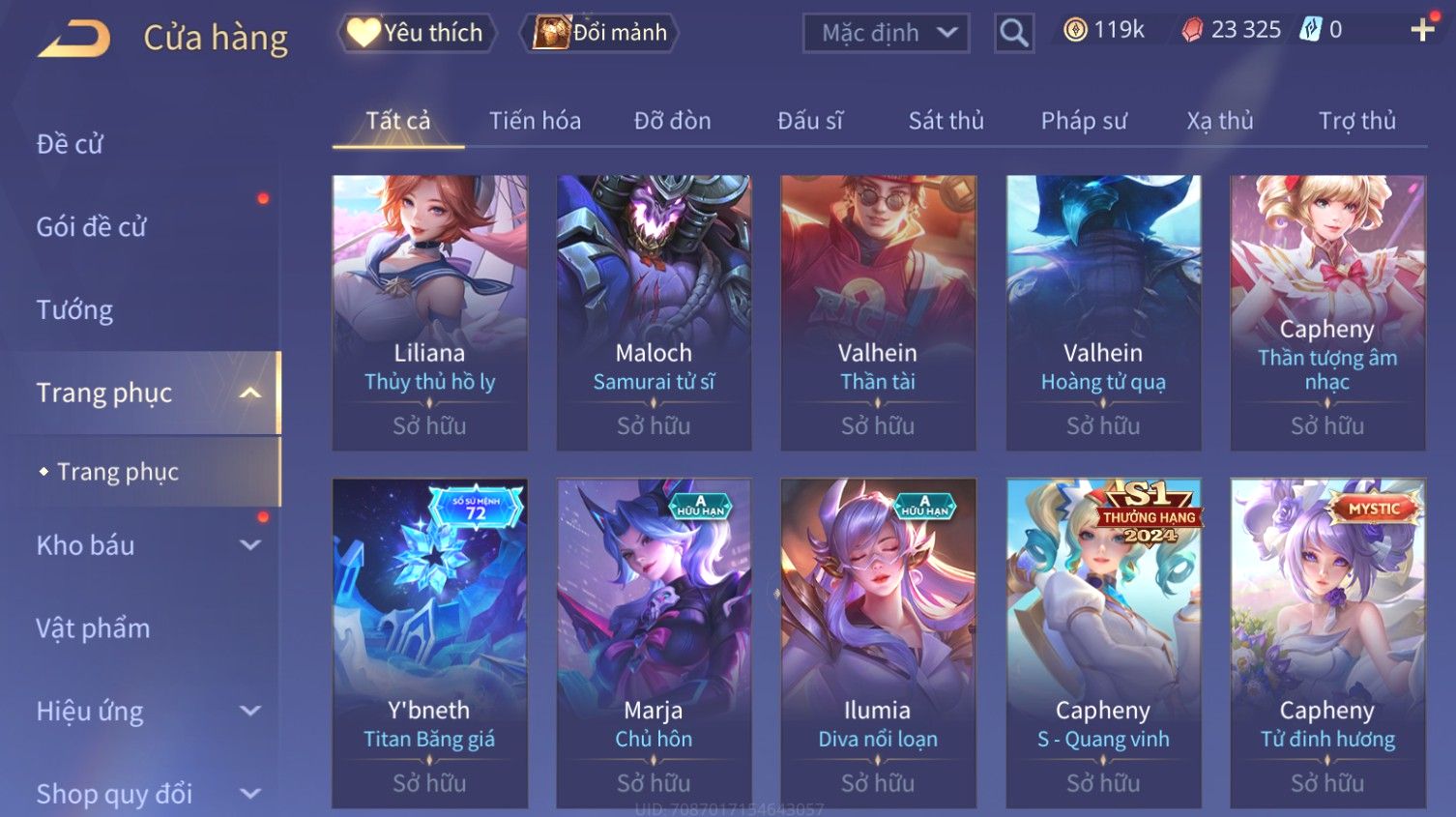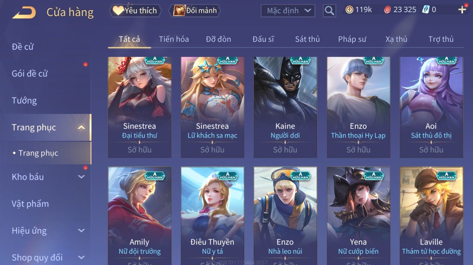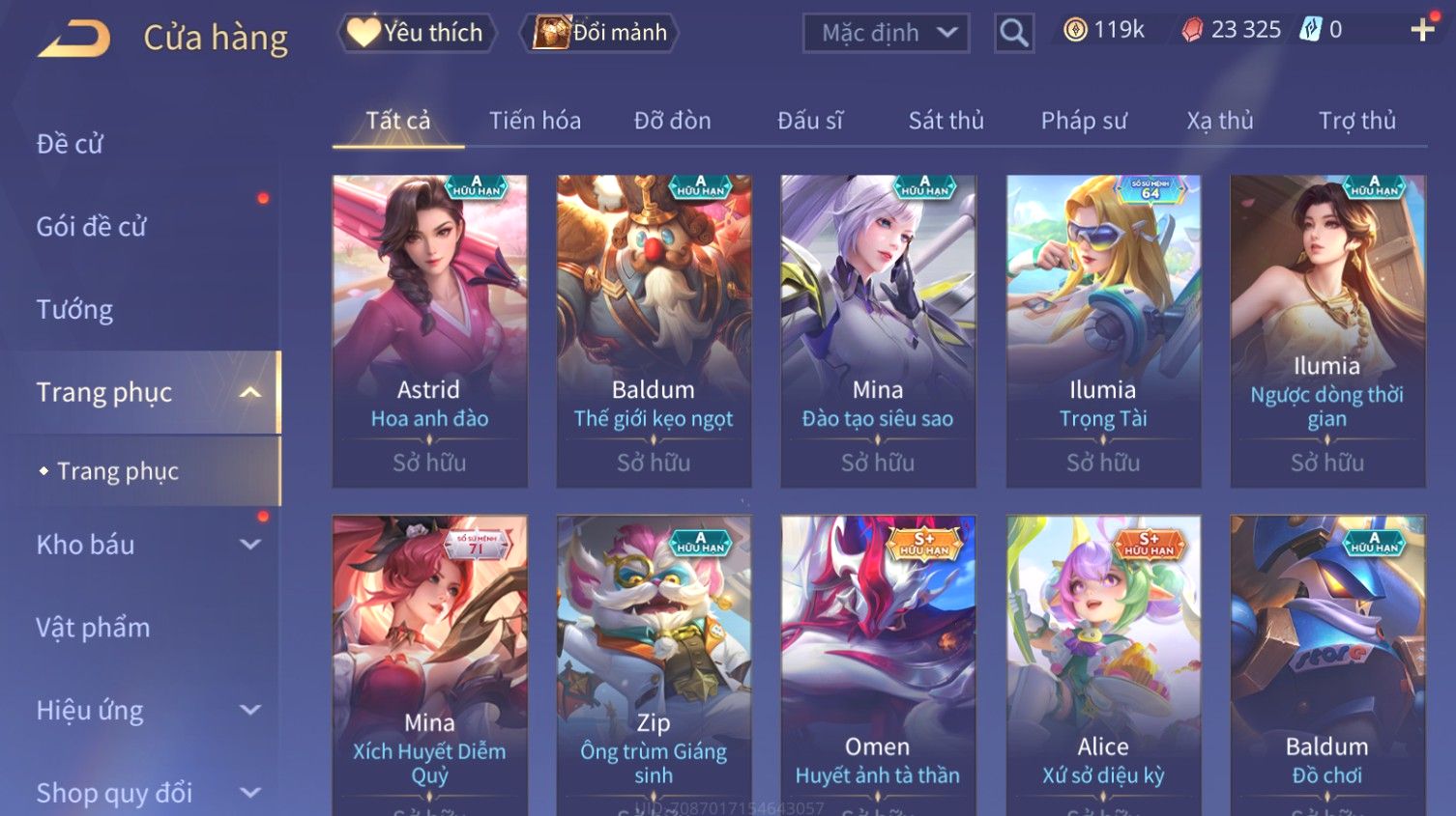 Nổi bật: Skin: Butterfly Kim Ngư Thần Nữ×Tel'Annas Thiên Vũ Thần Long×Điêu Thuyền Thất Tịch Tiên Tử×Quillen Đặc Công Mãng Xà×Capheny Tử Đinh Hương×Florentino Giám Sát Tinh Hệ×Aya Mc Sóc Nhỏ×Full Ngọc, Nhiều Skin SS Đẹp