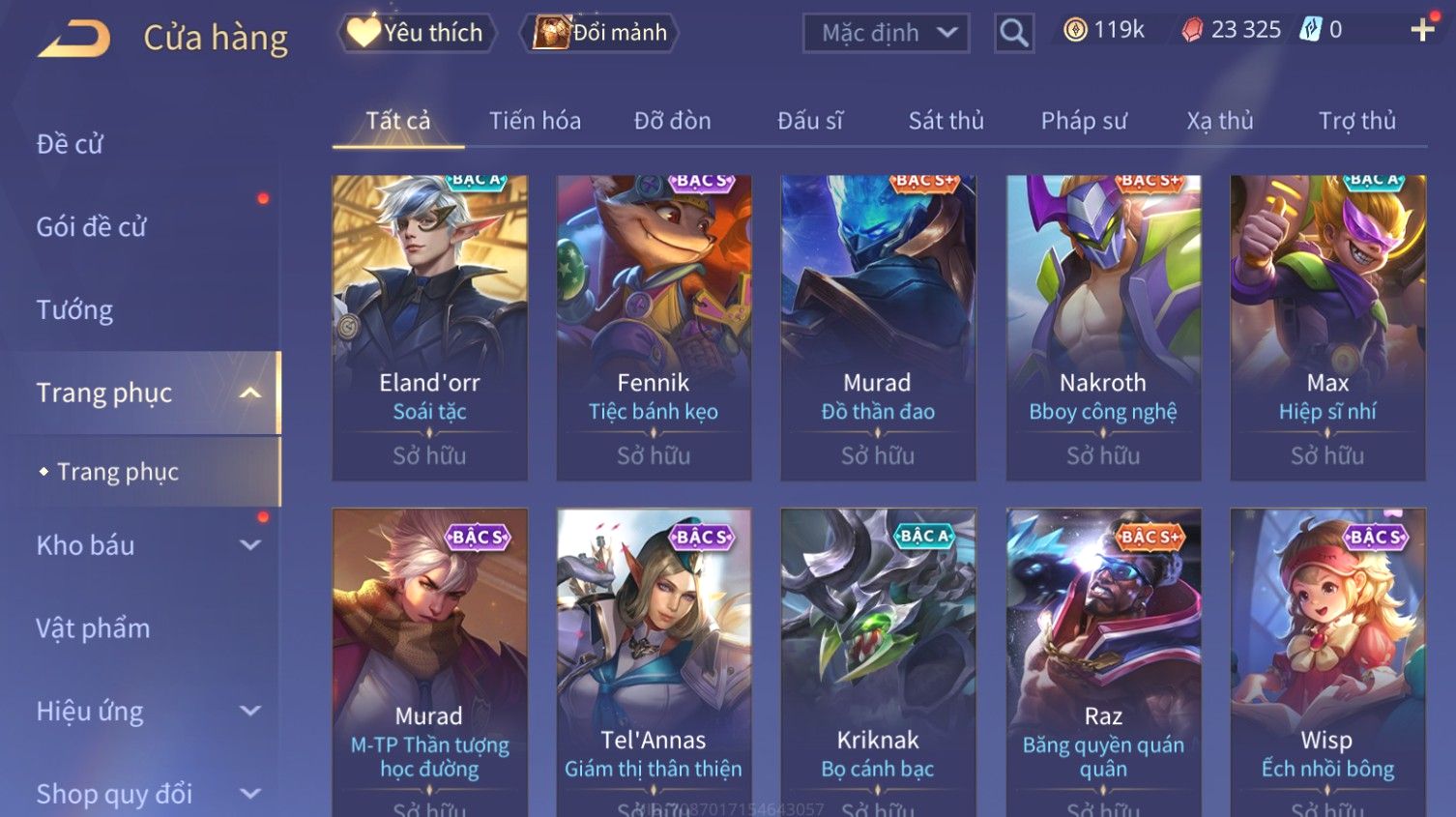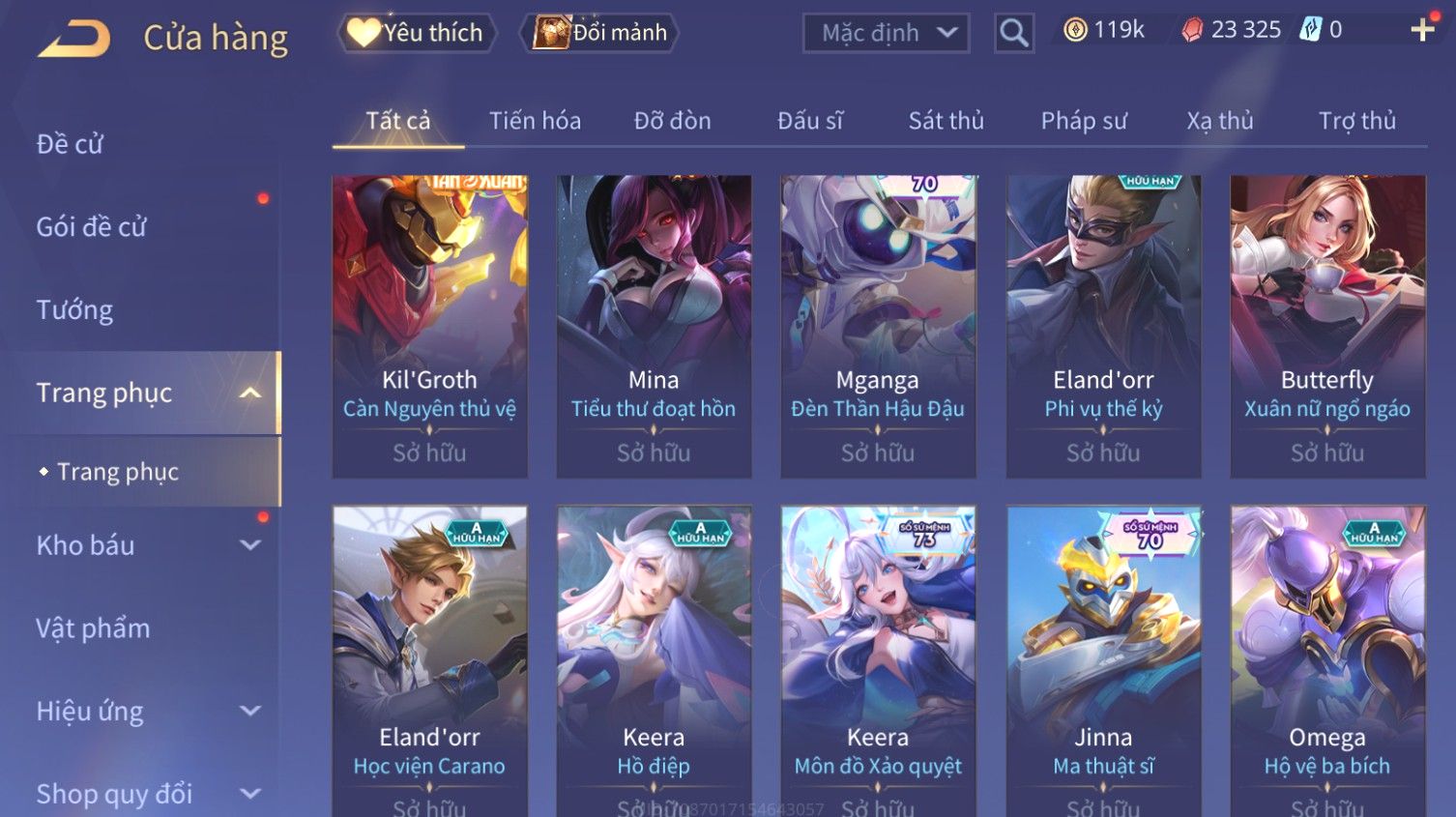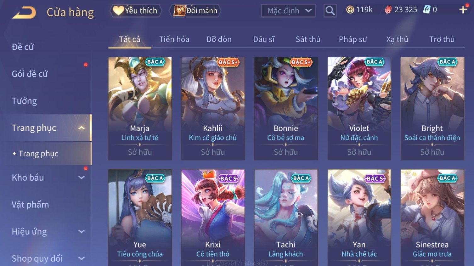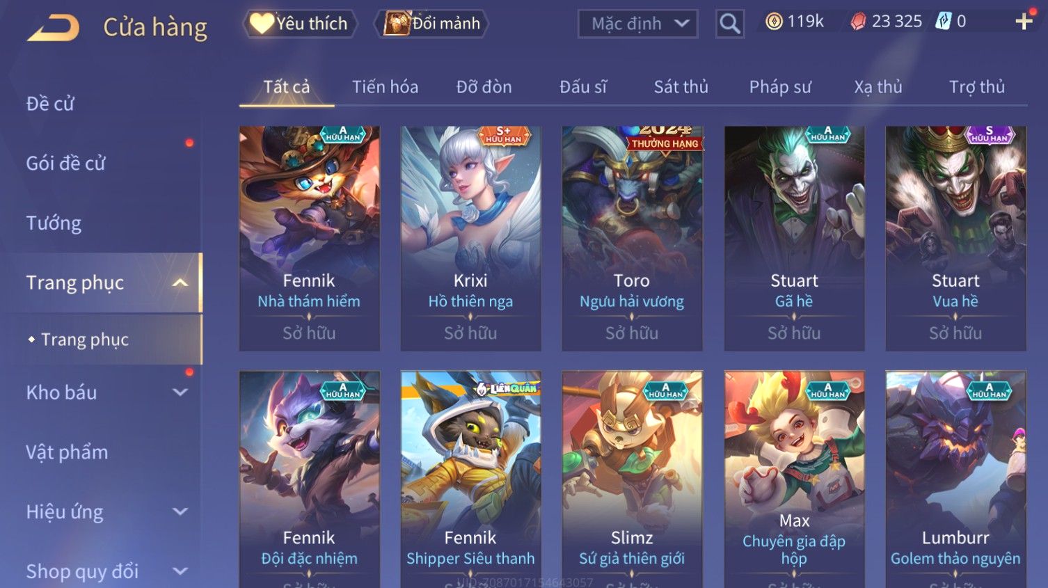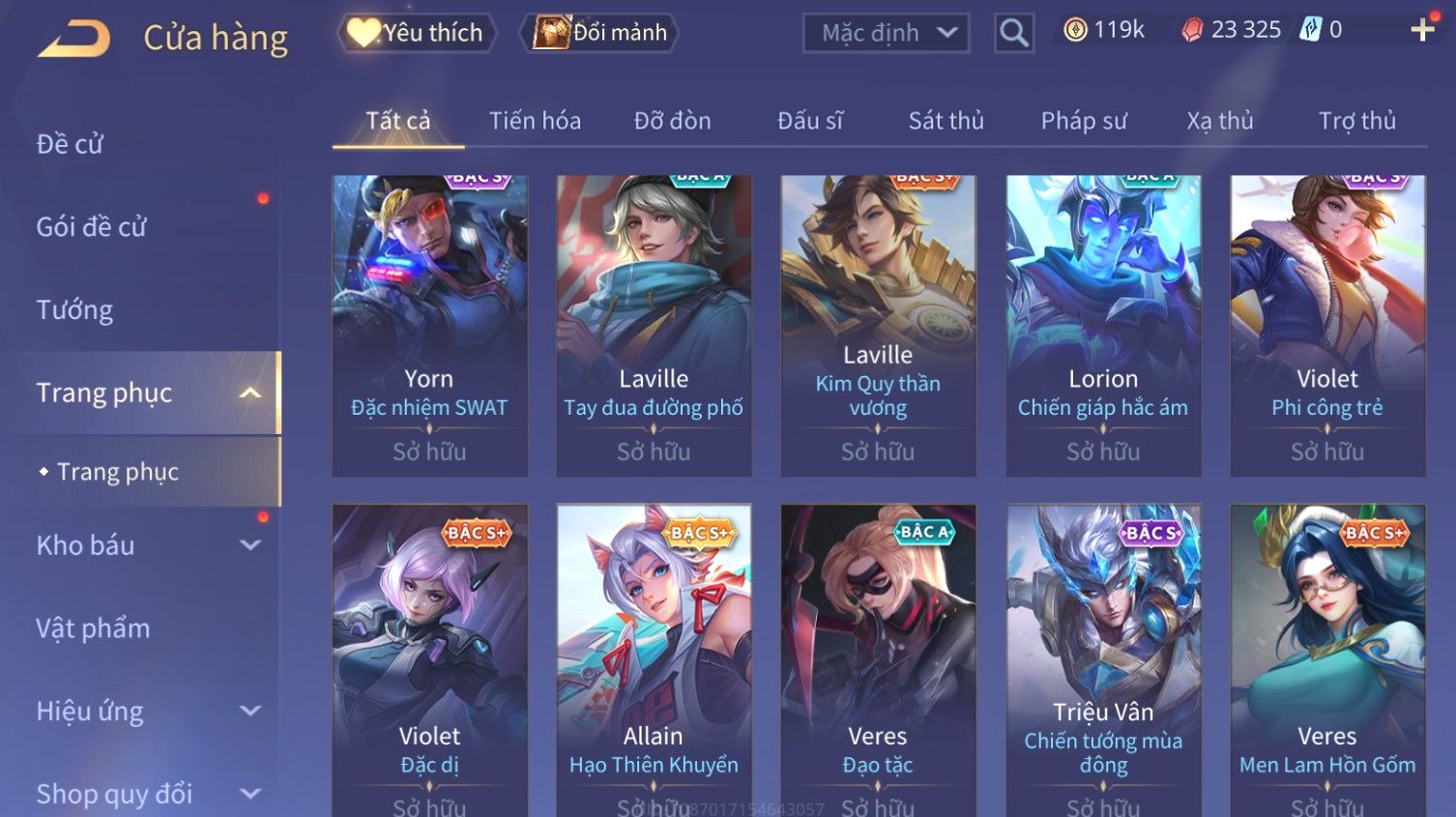 Nổi bật: Skin: Butterfly Kim Ngư Thần Nữ×Tel'Annas Thiên Vũ Thần Long×Điêu Thuyền Thất Tịch Tiên Tử×Quillen Đặc Công Mãng Xà×Capheny Tử Đinh Hương×Florentino Giám Sát Tinh Hệ×Aya Mc Sóc Nhỏ×Full Ngọc, Nhiều Skin SS Đẹp