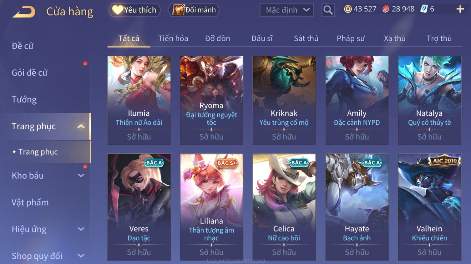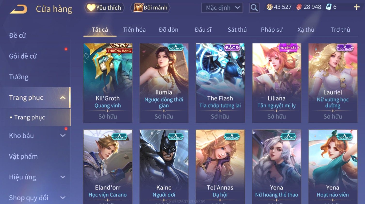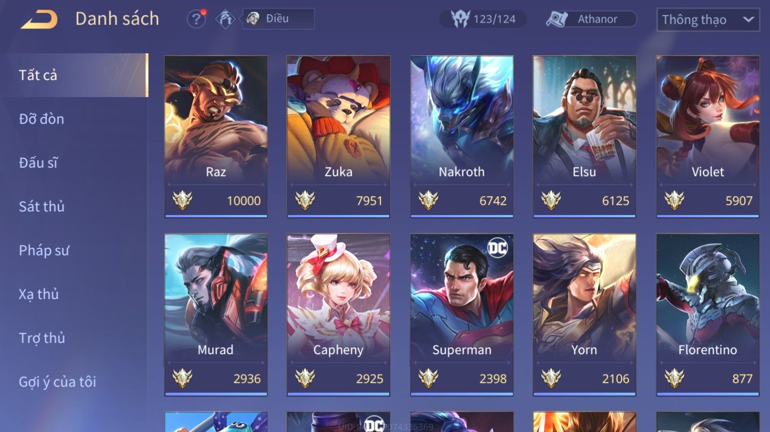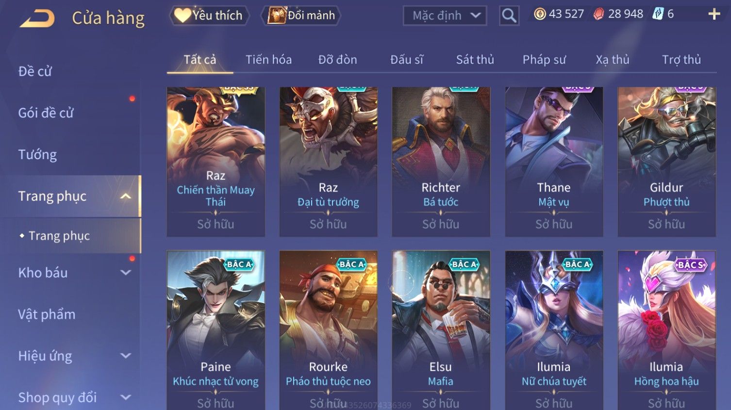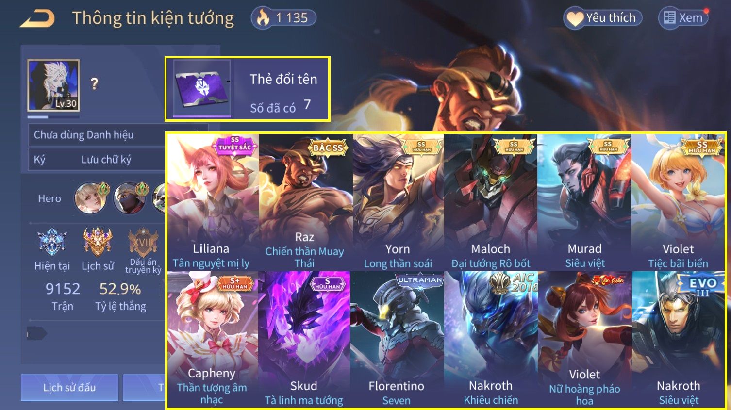 Nổi bật: Skin: Liliana Tân Nguyệt Mị Ly×Raz Chiến Thần Muay Thái×Yorn Long Thần Soái×Maloch Đại Tướng Nguyệt Tộc×Florentino Seven×Full Ngọc, Nhiều Skin SS Đẹp