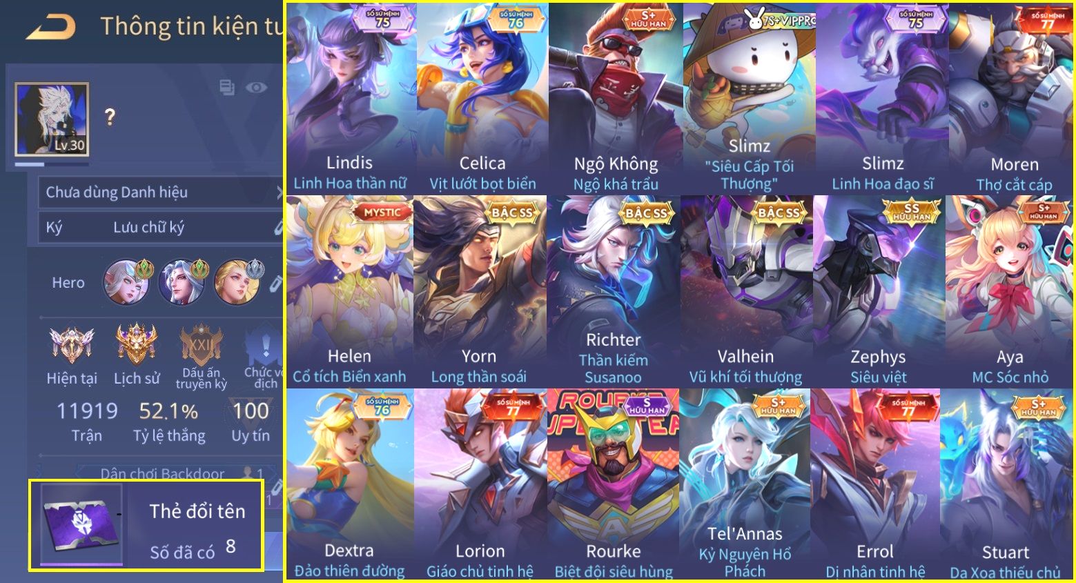 Nổi bật: Skin: Yorn Long Thần Soái×Richter Thần Kiếm Susanoo×Zephys Siêu Việt×Aya Mc Sóc Nhỏ×Full Ngọc, Nhiều Skin SS Đẹp