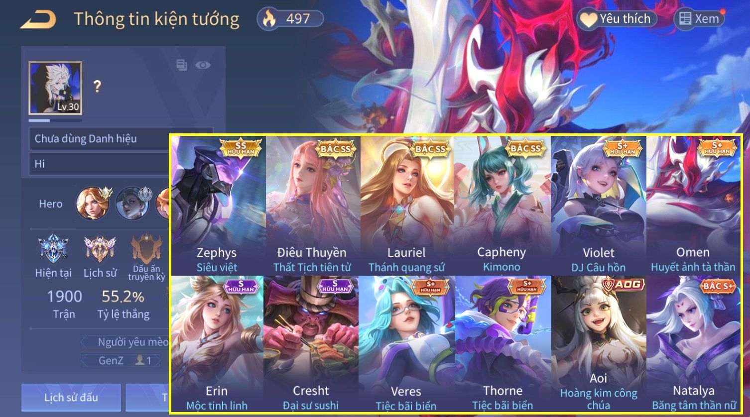 Nổi bật: Skin: Zephys Siêu Việt×Điêu Thuyền Thất Tịch Tiên Tử×Lauriel Thánh Quang Sứ×Capheny Kimono×Violet DJ Câu Hồn×Aoi Hoàng Kim Công Chúa×