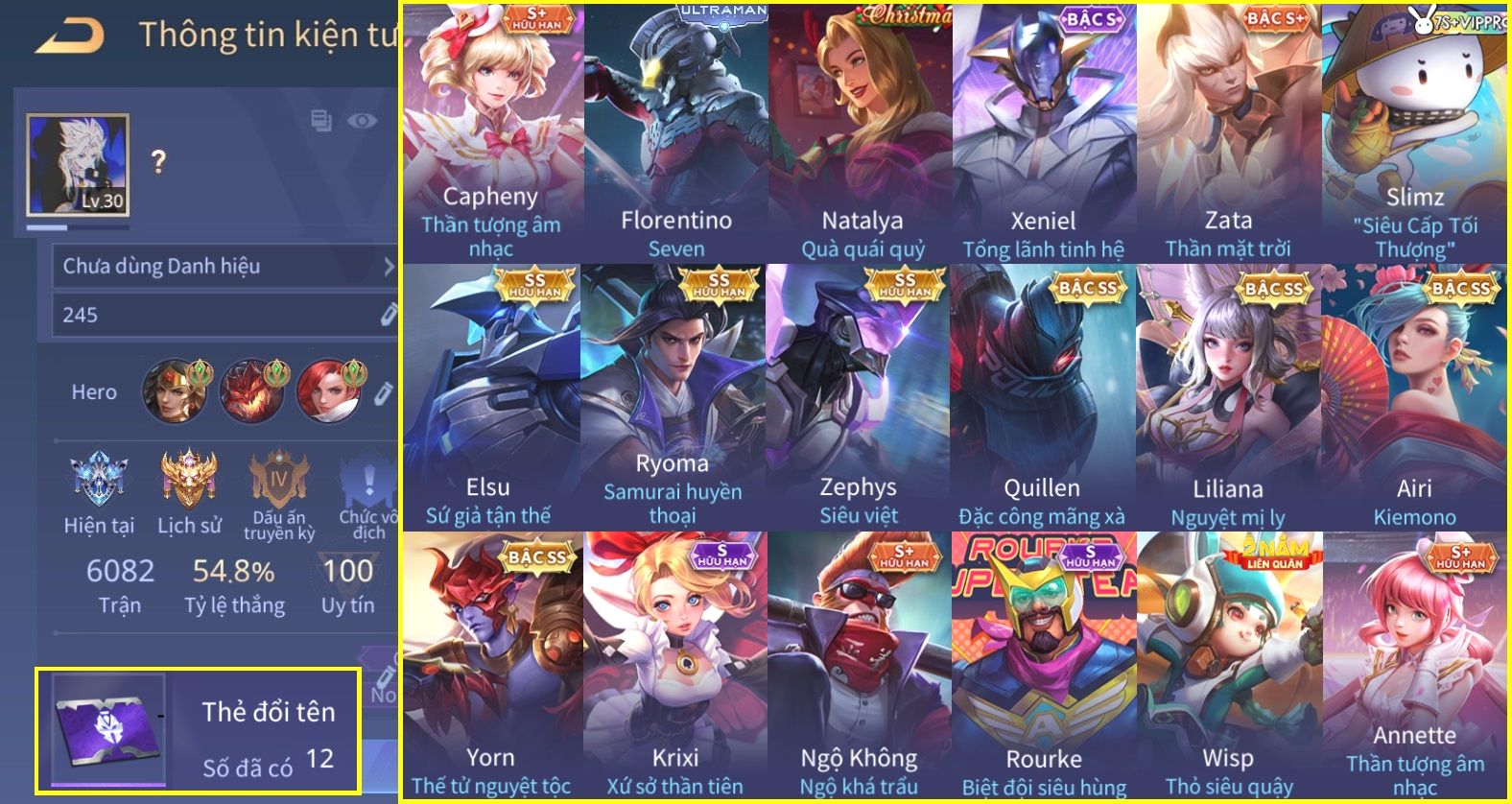 Nổi bật: Skin: Ryoma Sumarai Huyền Thoại×Elsu Sử Giả Tận Thế×Zephys Siêu Việt×Quillen Đặc Công Mãng Xà×Airi Kiemono×Liliana Nguyệt Mị Ly×Florentino Seven×Wisp Thỏ Siêu Quậy×Full Ngọc, Nhiều Skin SS Đẹp