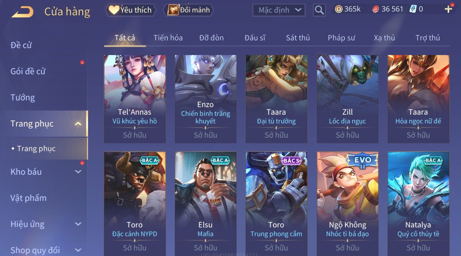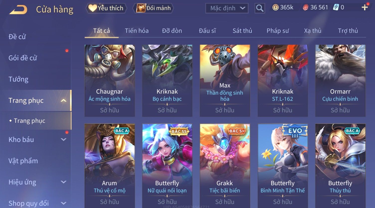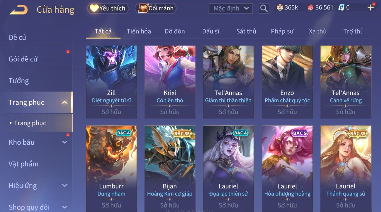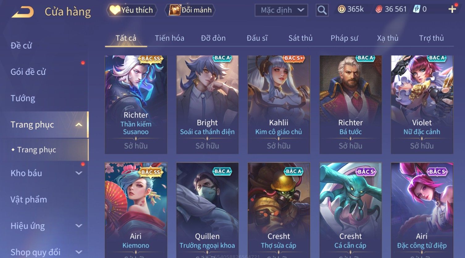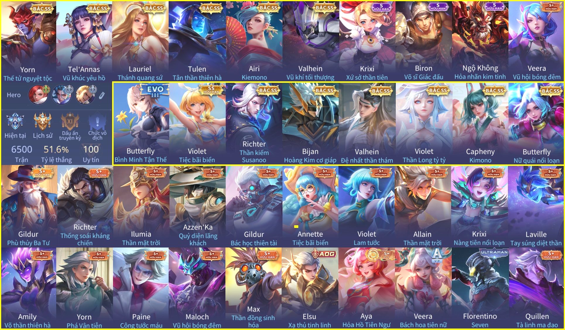 Nổi bật: Skin: Violet Tiệc Bãi Biển×Violet Thần Long Tỷ Tỷ×Richter Thần Kiếm Susanoo×Bijan Hoàng Kim Cơ Giáp×Valhein Đệ Nhất Thần Thám×Capheny Kimono×Lauriel Thánh Quang Sứ×Airi Kiemono×Full Ngọc, Nhiều Skin SS Đẹp
