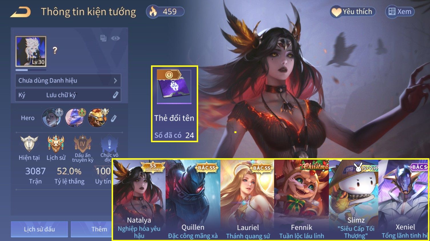 Nổi bật: Skin: Natalya Nghiệp Hỏa Yêu Hậu×Quillen Đặc Công Mãng Xà×Lauriel Thánh Quang Sứ×Fennik Tuần Lộc Láu Lỉnh×Full Ngọc, Nhiều Skin SS Đẹp