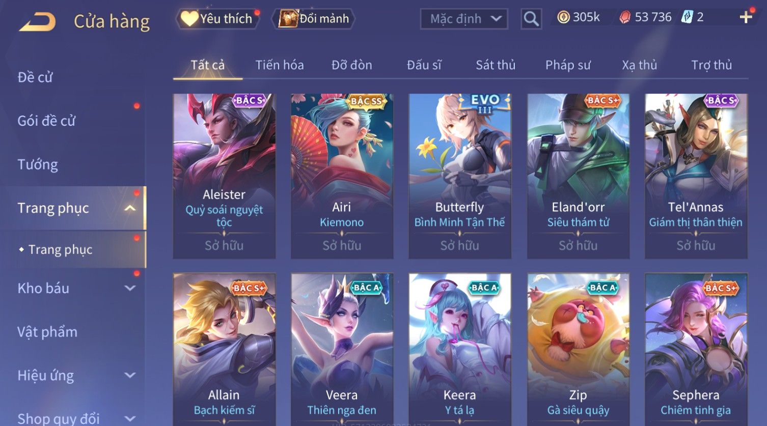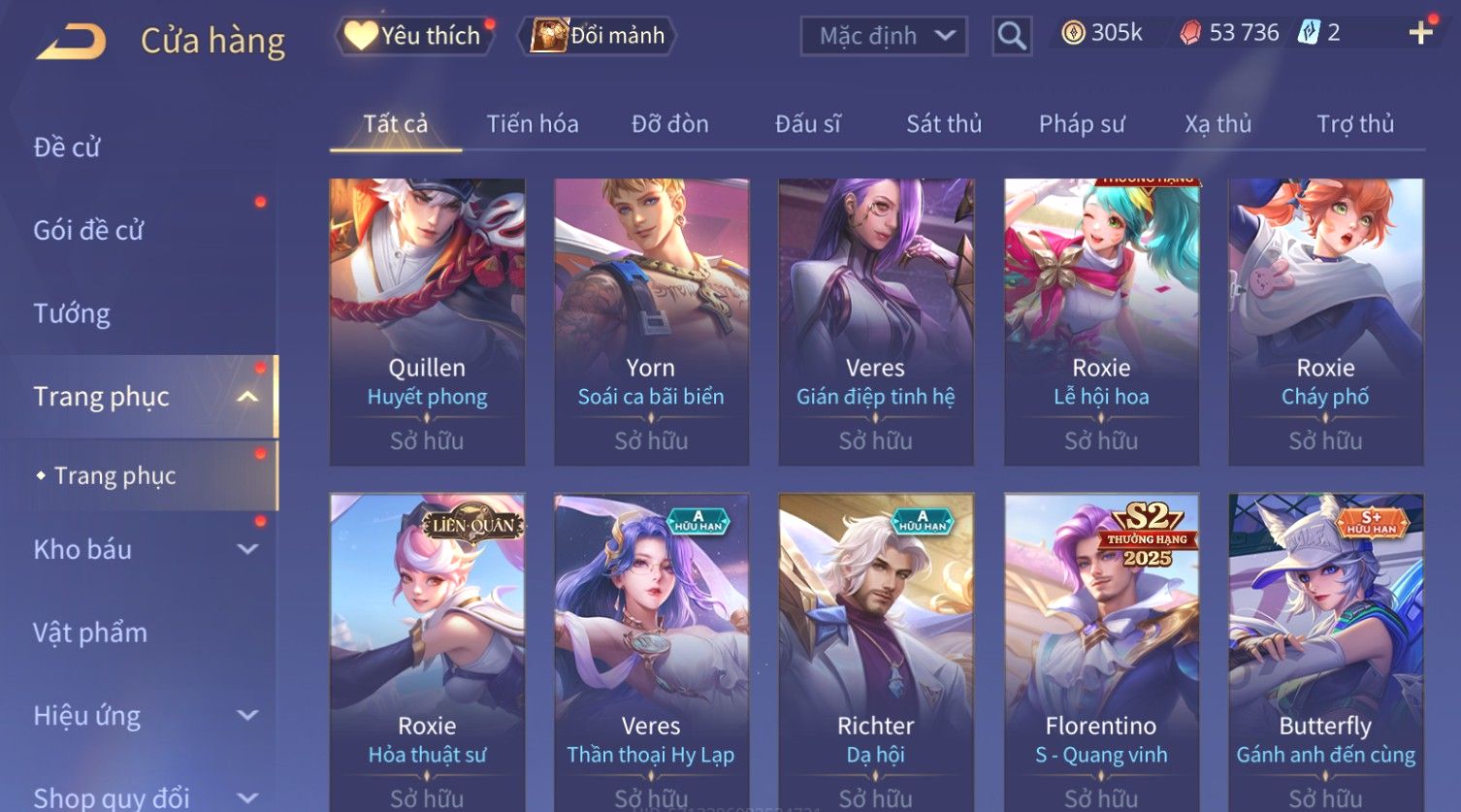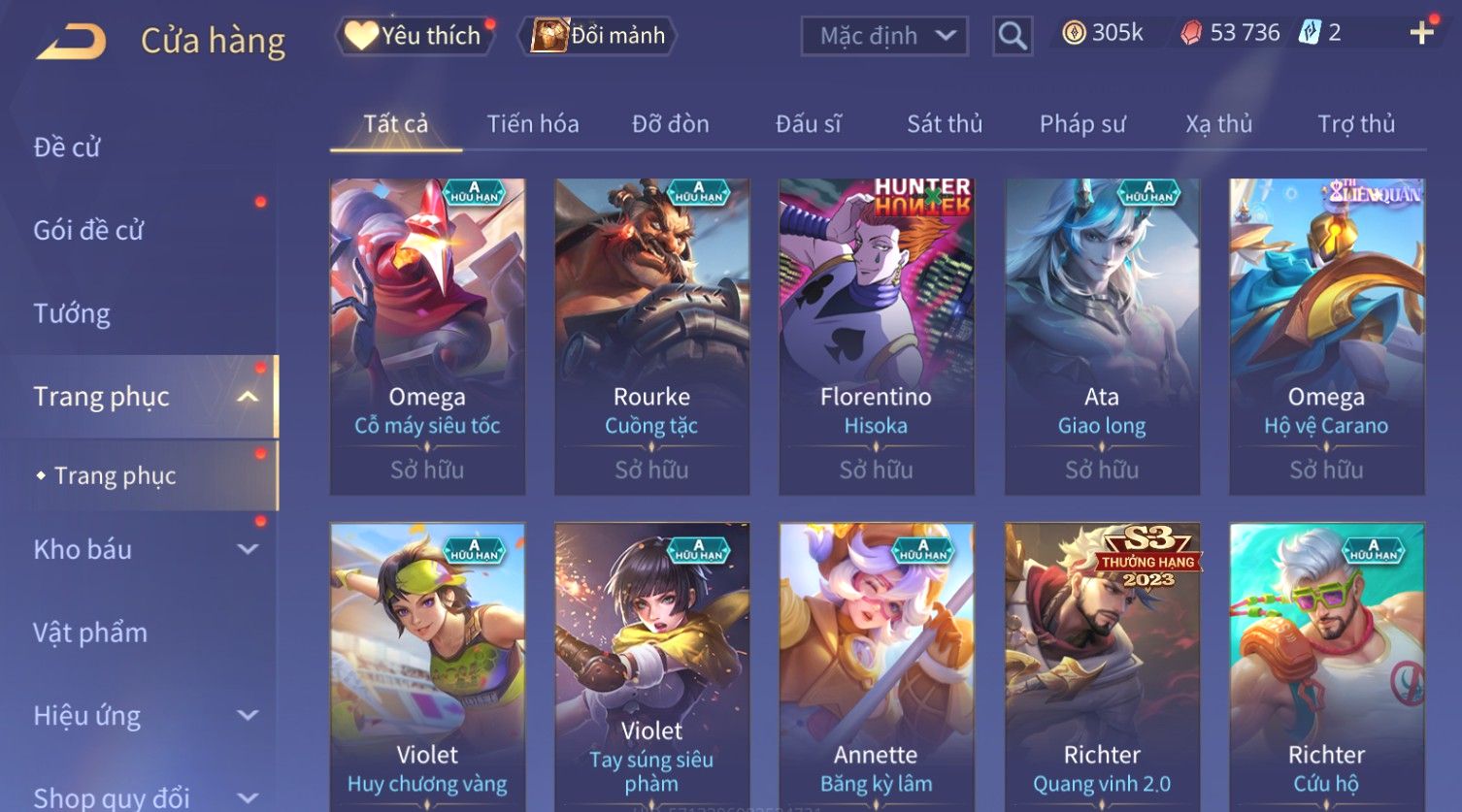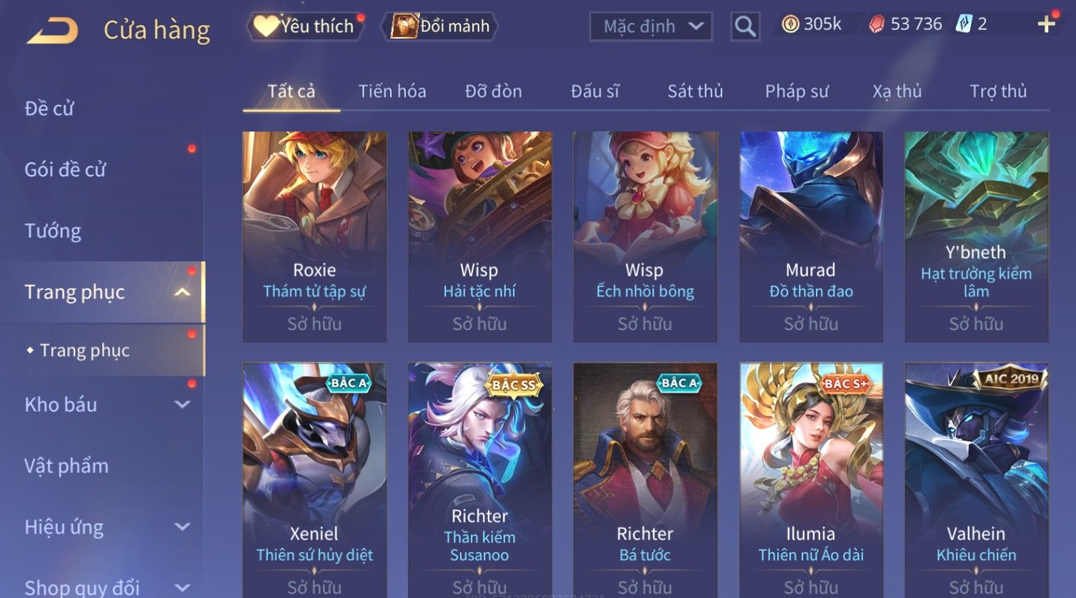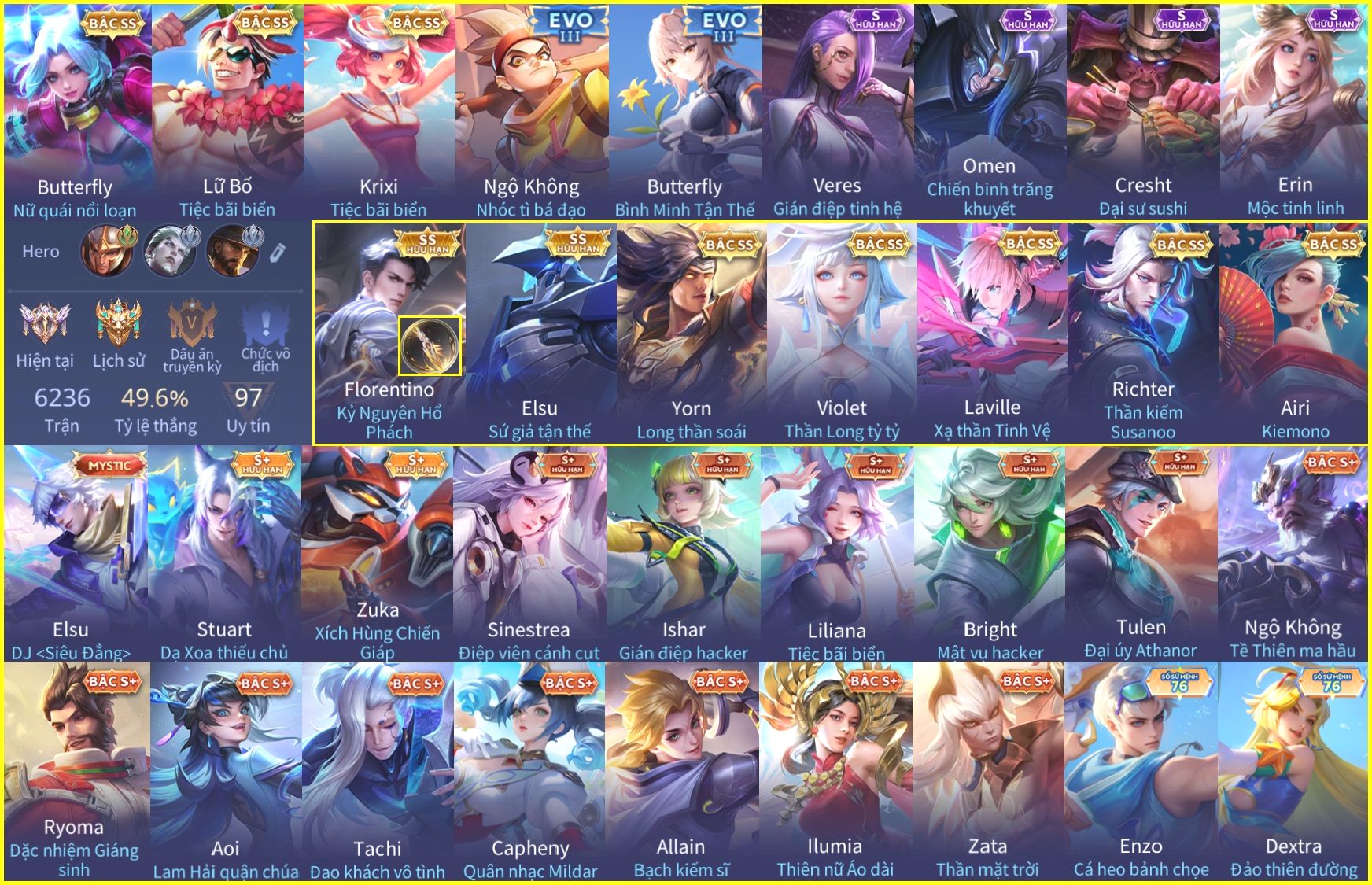 Nổi bật: Skin: Flo Kỷ Nguyên Hổ Phách×Elsu Sử Giả Tận Thế×Violet Thần Long Tỷ Tỷ×Yorn Long Thần Soái×Laville Xạ thần Tinh Vệ×Richter Thần Kiếm Susanoo×Airi Kiemono×Full Ngọc, Nhiều Skin SS Đẹp