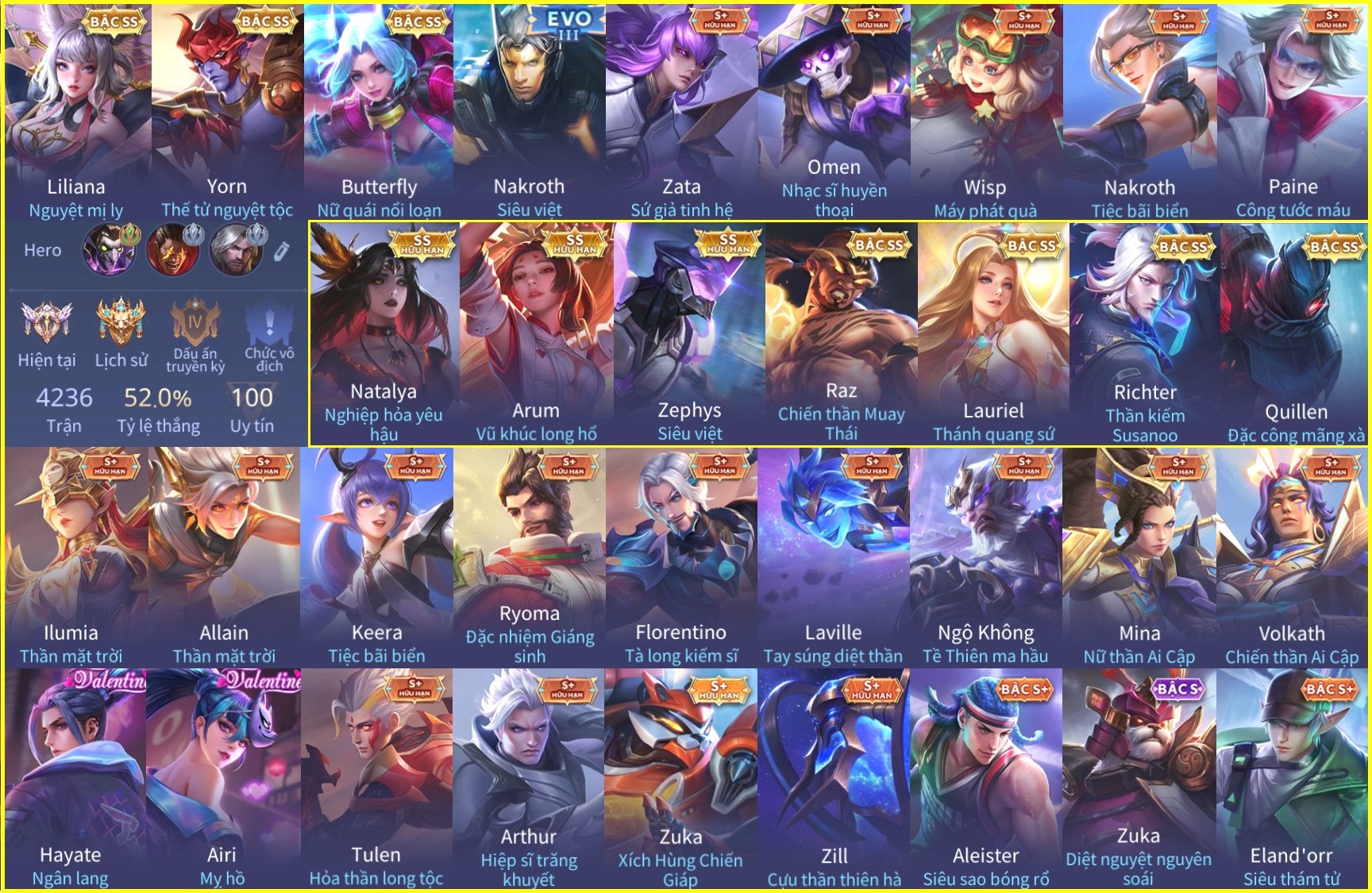 Nổi bật: Skin: Raz Chiến Thần Muay Thái×Natalya Nghiệp Hỏa Yêu Hậu×Arum Vũ Khúc Long Hổ×Zephys Siêu Việt×Lauriel Thánh Quang Sứ×Richter Thần Kiếm Susanoo×Quillen Đặc Công Mãng Xà×Zata Sứ Giả Tinh Hệ×Hayate Ngân Lang×Airi Mỵ Hồ×Full Ngọc, Nhiều Skin SS Đẹp