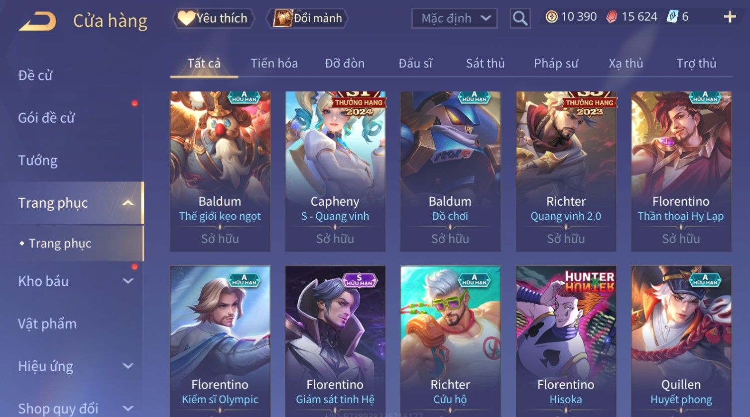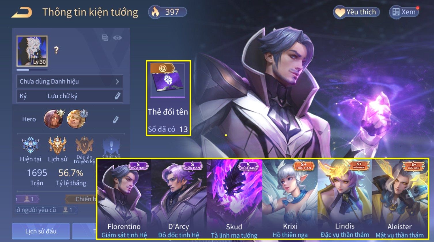 Nổi bật: Skin: Florentino Giám Sát Tinh Hệ×D'Arcy Đô Đốc Tinh Hệ×Skud Tà Linh Ma Tướng×Lindis Đặc Vụ Thần Thám×Aleister Mật Vụ Thần Thám×