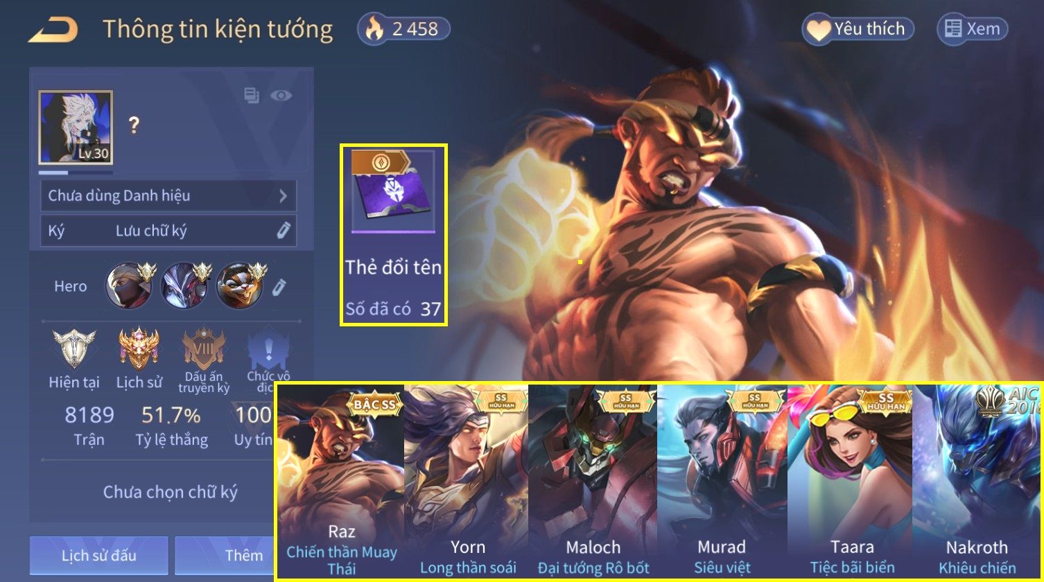 Nổi bật: Skin: Raz Chiến Thần Muay Thái×Yorn Long Thần Soái×Maloch Đại Tướng Rô Bốt×Taara Tiệc Bãi Biển×Full Ngọc, Nhiều Skin SS Đẹp