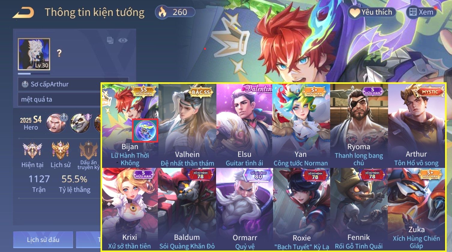 Nổi bật: Skin: Bijan Hoàng Kim Cơ Giáp×Valhein Đệ Nhất Thần Thám×Elsu Guitar Tình Ái×Yan Công Tước Norman×Ryoma Thanh Long Bang Chủ×Arthur Tôn Hổ Vô Song×BIJAN LỮ HÀNH THỜI KHÔNG