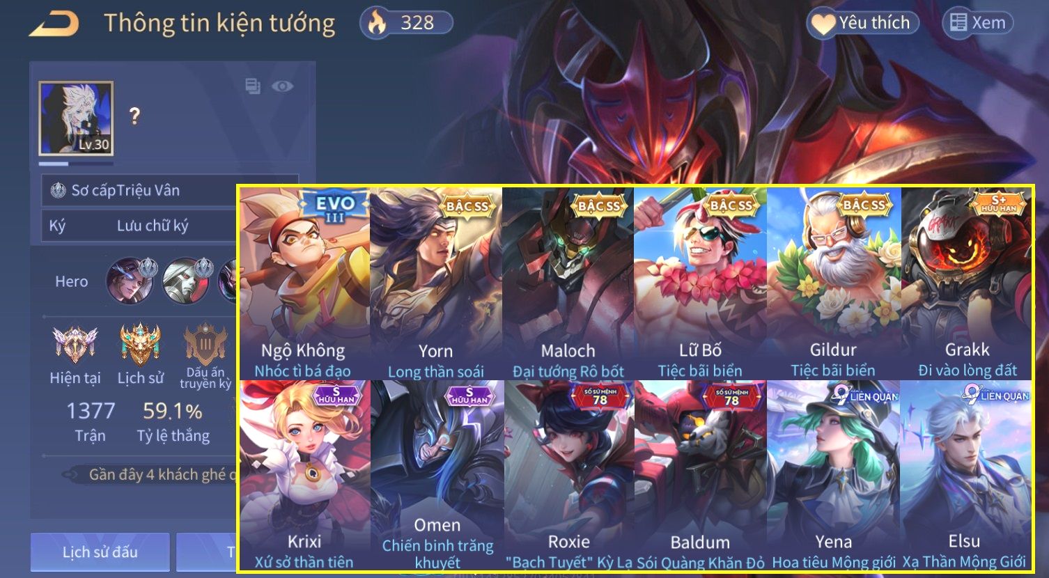 Nổi bật: Skin: Yorn Long Thần Soái×Ngộ Không Nhóc Tì Bá Đạo×Maloch Đại Tướng Rô Bốt×Gildur Tiệc Bãi Biển×Lữ Bố Tiệc Bãi Biển×Grakk Đi Vào Lòng Đất×Omen Chiến Binh Trăng Khuyết×