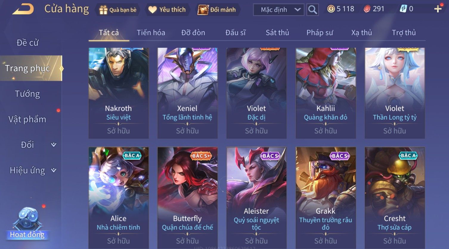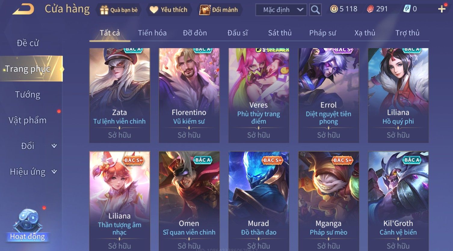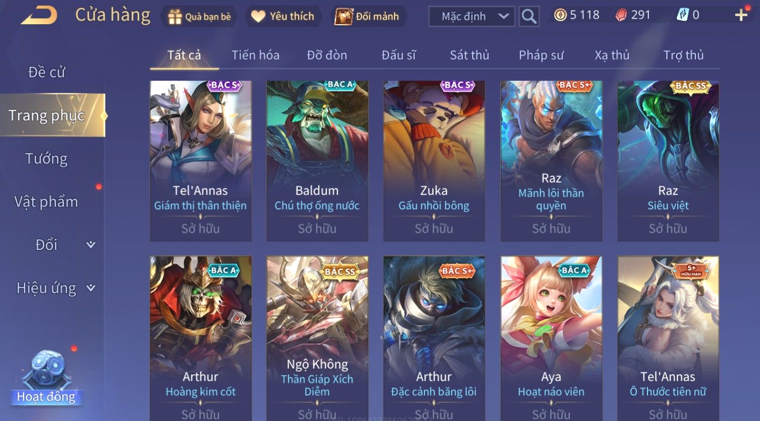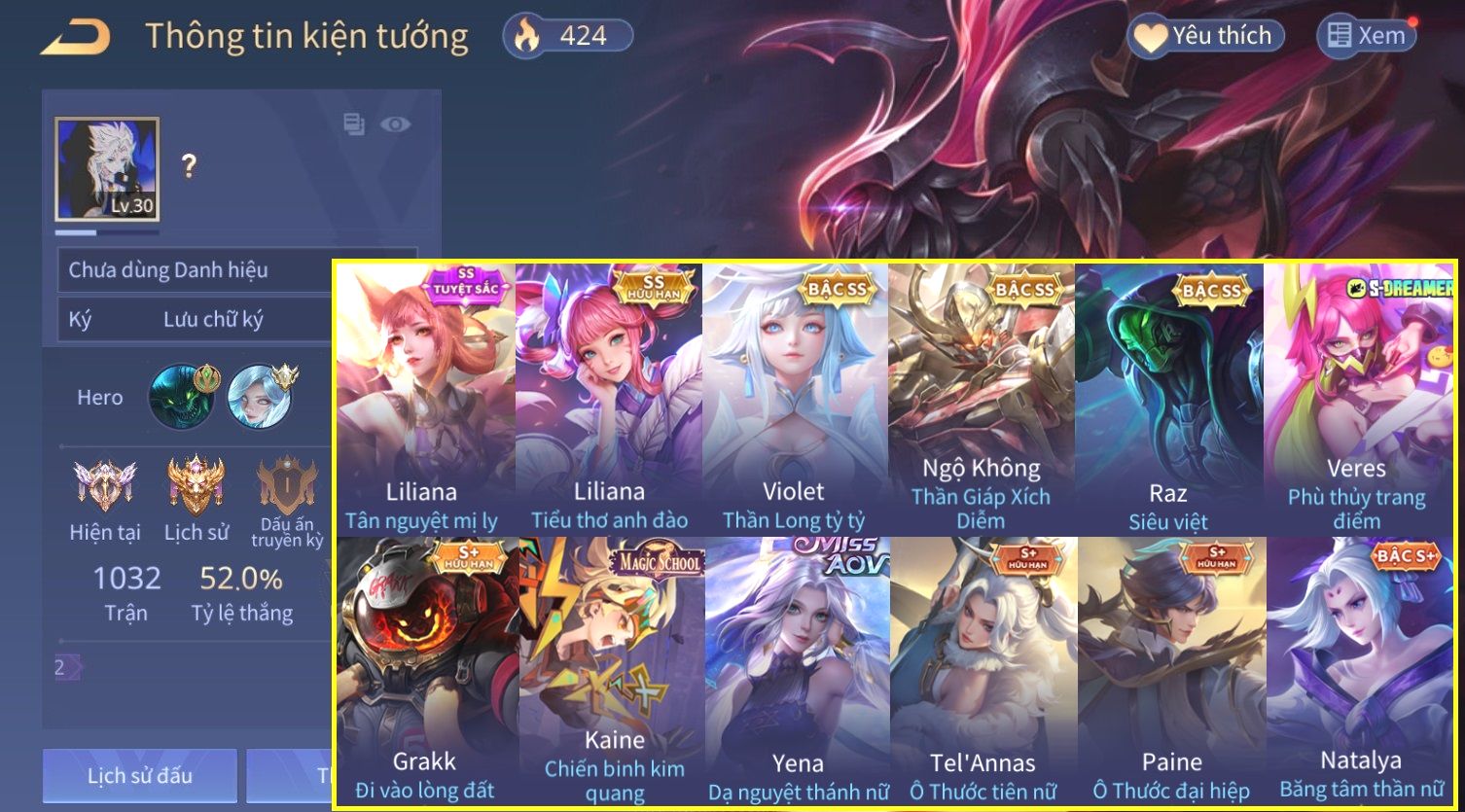 Nổi bật: Skin: Liliana Tân Nguyệt Mị Ly×Liliana Tiểu Thơ Anh Đào×Violet Thần Long Tỷ Tỷ×Ngộ Không Thần Giáp Xích Diễm×Raz Siêu Việt×Veres Phù Thủy Trang Điểm×Grakk Đi Vào Lòng Đất×Tel'Annas Ô Thước Tiên Nữ×Paine Ô Thước Đại Hiệp×