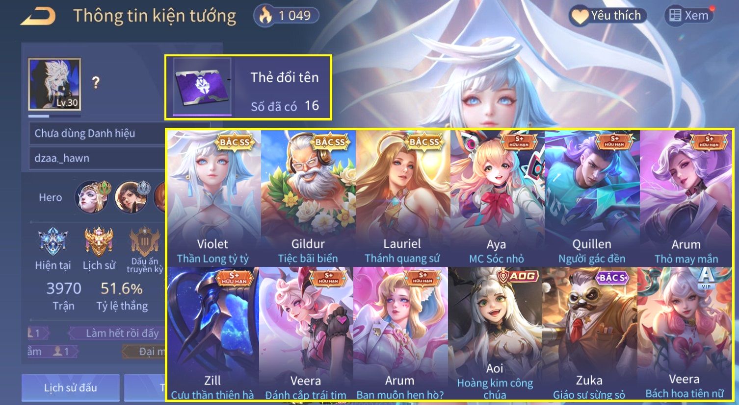 Nổi bật: Skin: Violet Thần Long Tỷ Tỷ×Lauriel Thánh Quang Sứ×Gildur Tiệc Bãi Biển×Aya Mc Sóc Nhỏ×Aoi Hoàng Kim Công Chúa×Full Ngọc, Nhiều Skin SS Đẹp