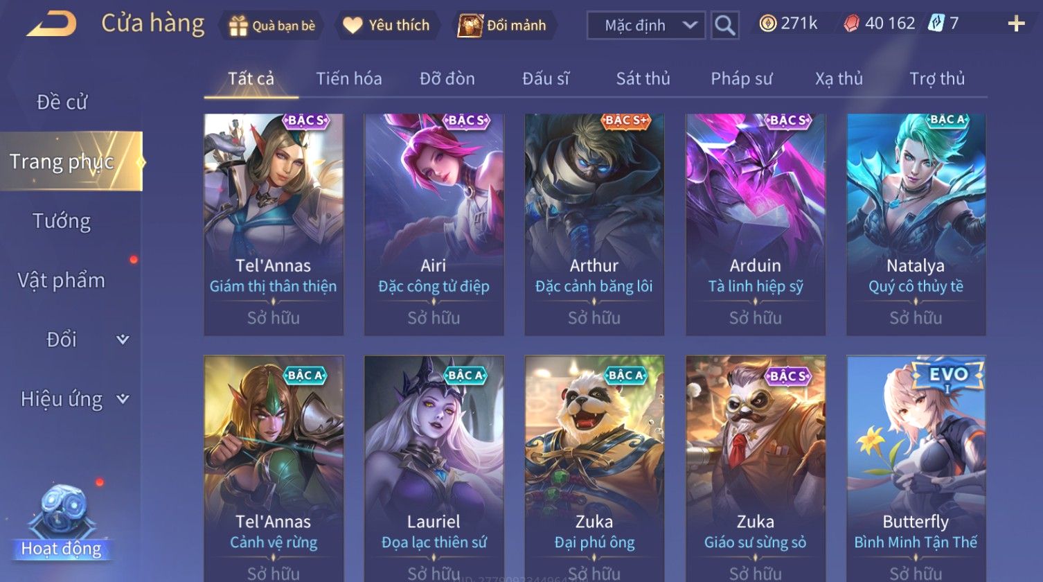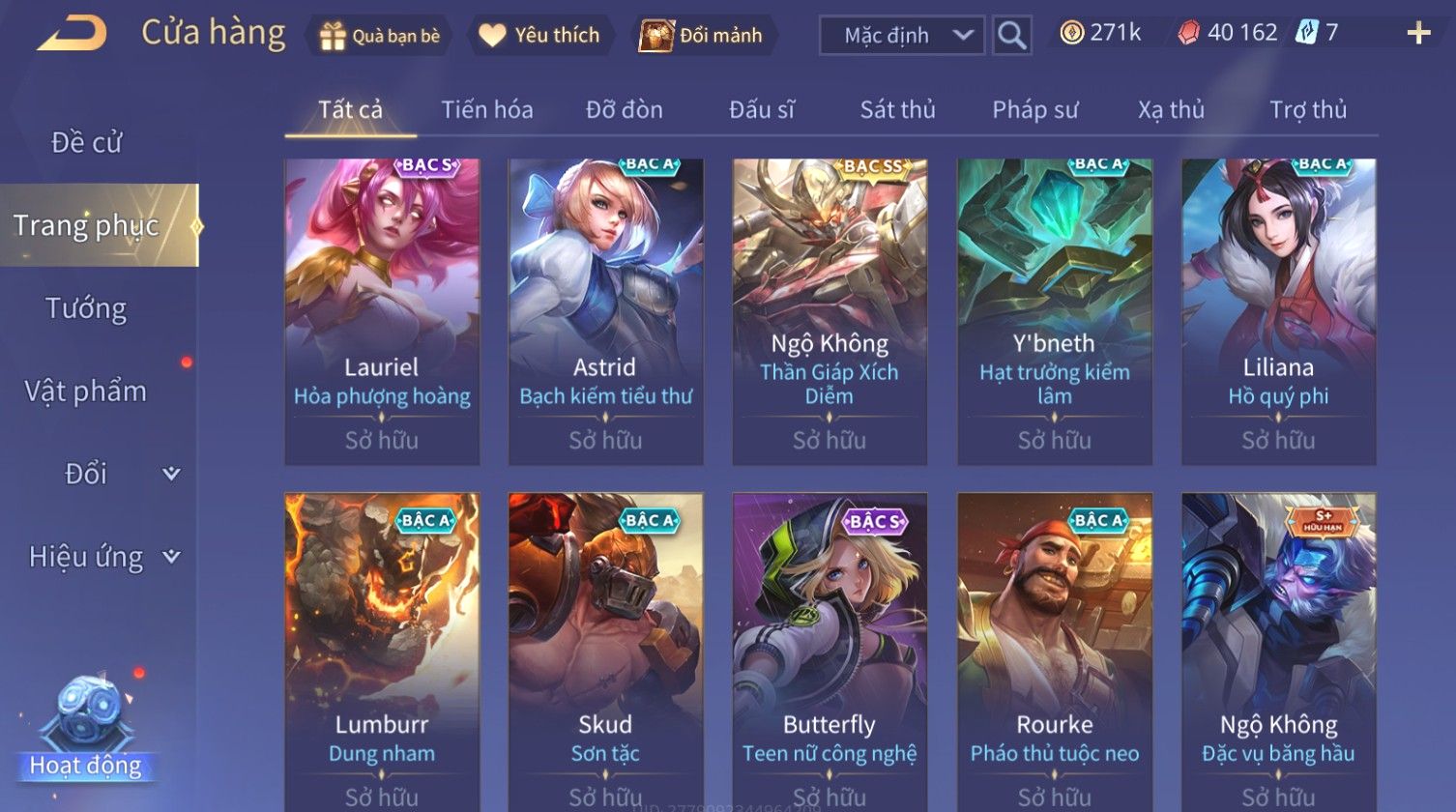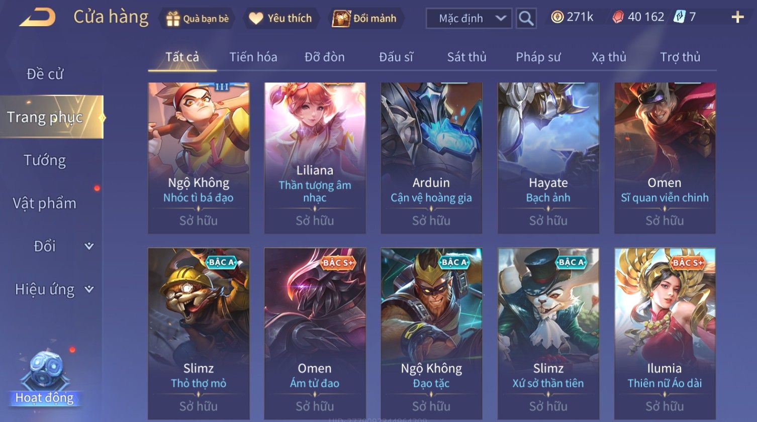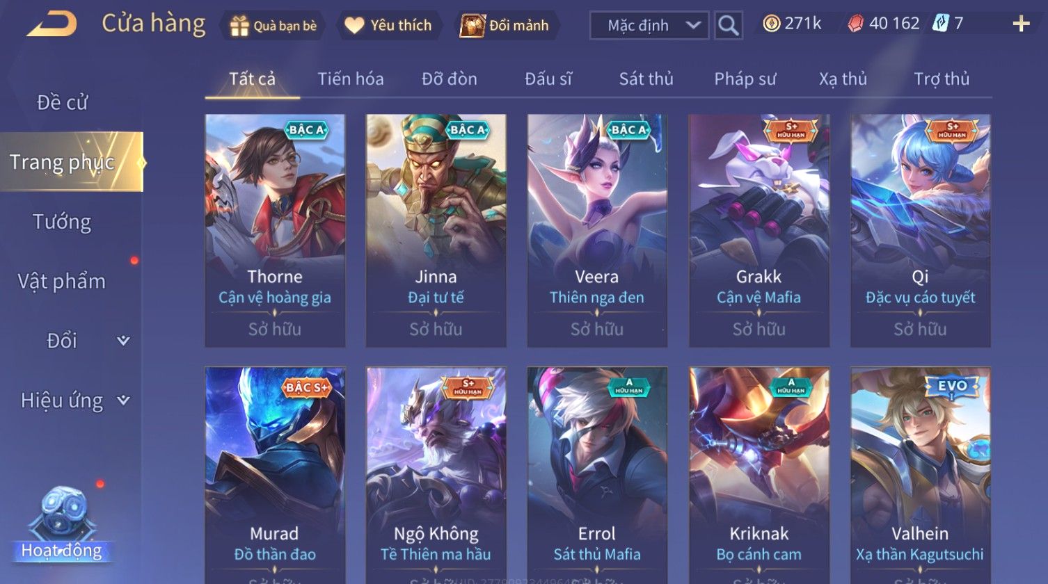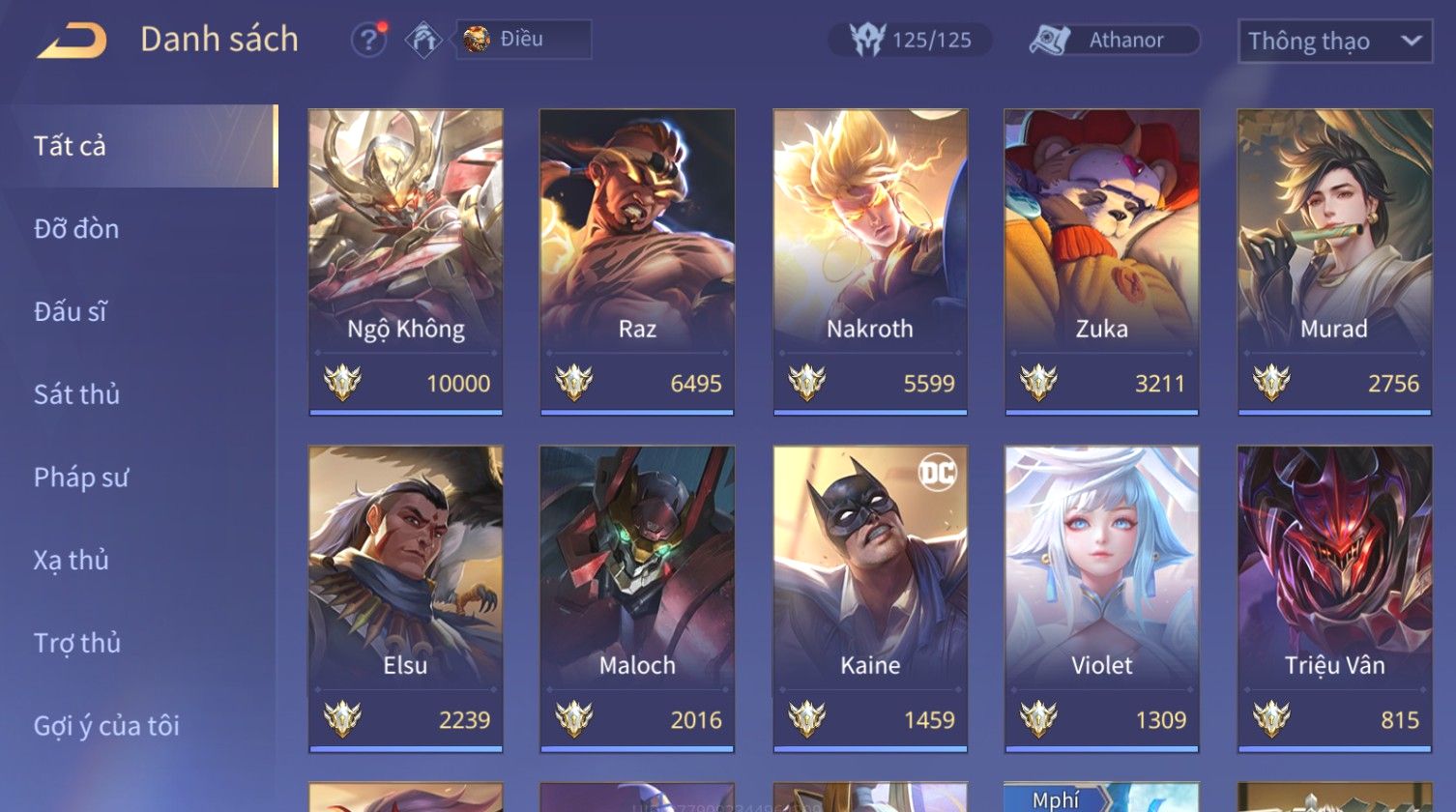 Nổi bật: Skin: Nakroth Lôi Quang Sứ×Murad Chí Tôn Thần Kiếm×Liliana Tiểu Thơ Anh Đào×Ngộ Không Thần Giáp Xích Diễm×Raz Chiến Thần Muay Thái×Violet Thần Long Tỷ Tỷ×Maloch Đại Tướng Rô Bốt×Ryoma Thanh Long Bang Chủ×Cresht Đại Sư Sushi×Full Ngọc, Nhiều Skin SS Đẹp