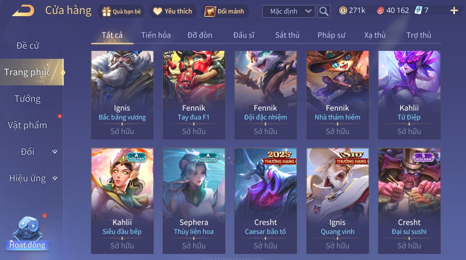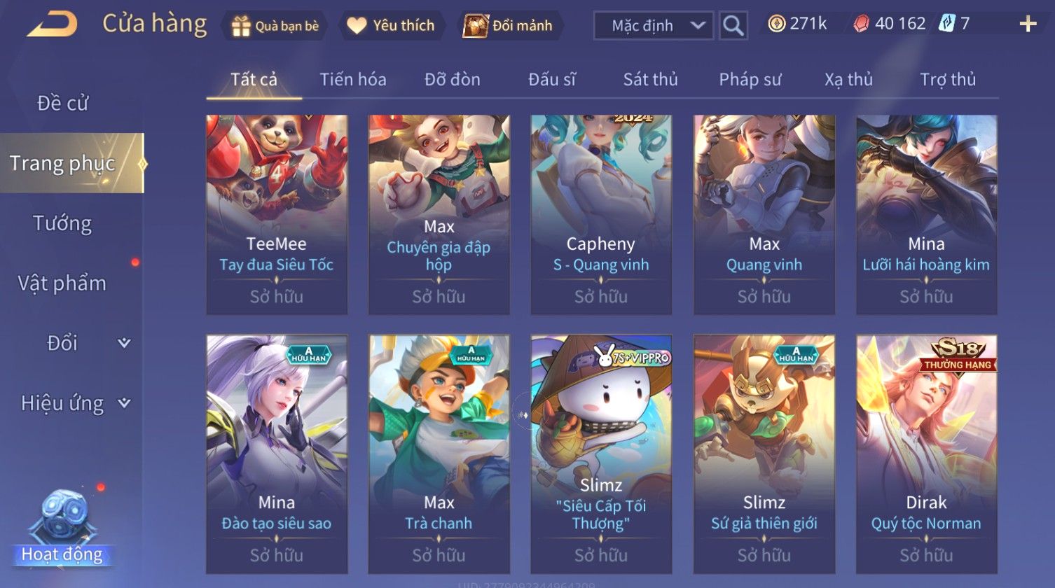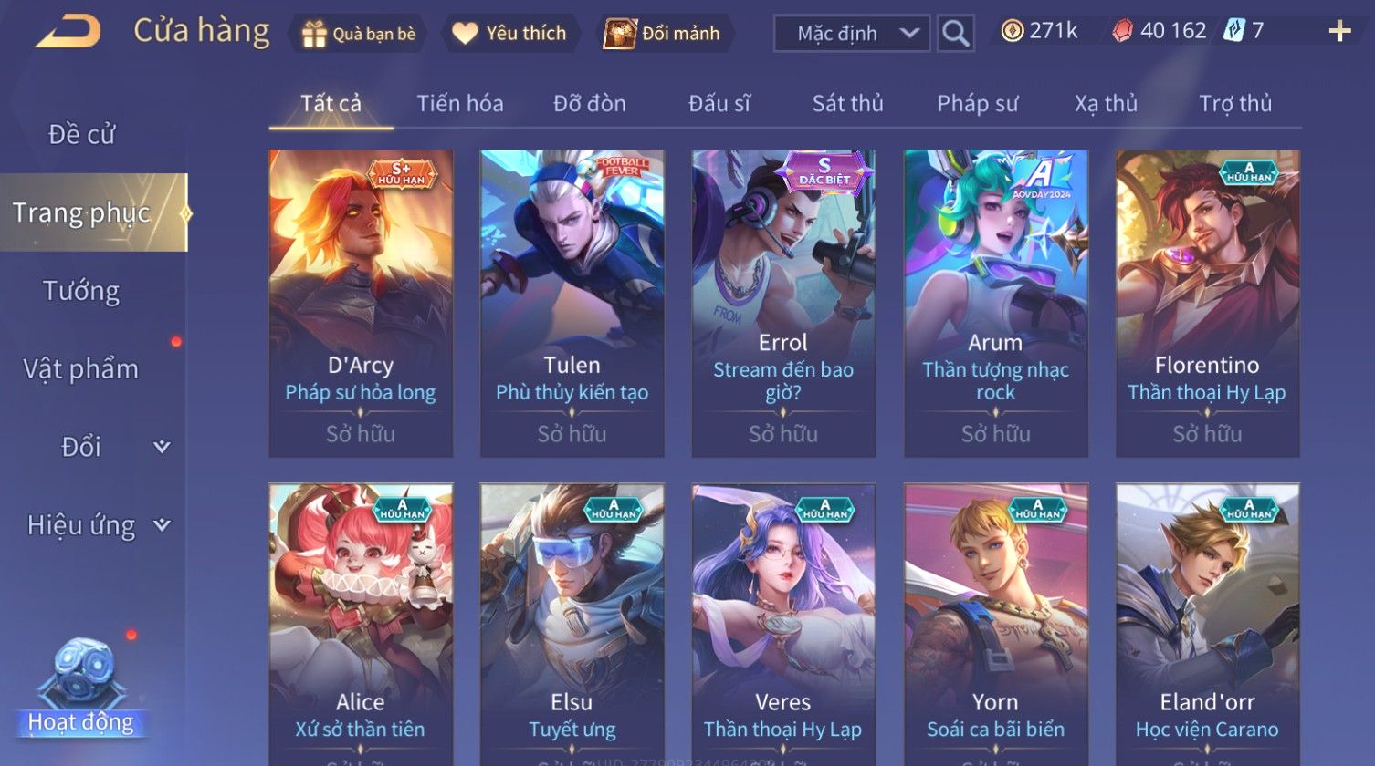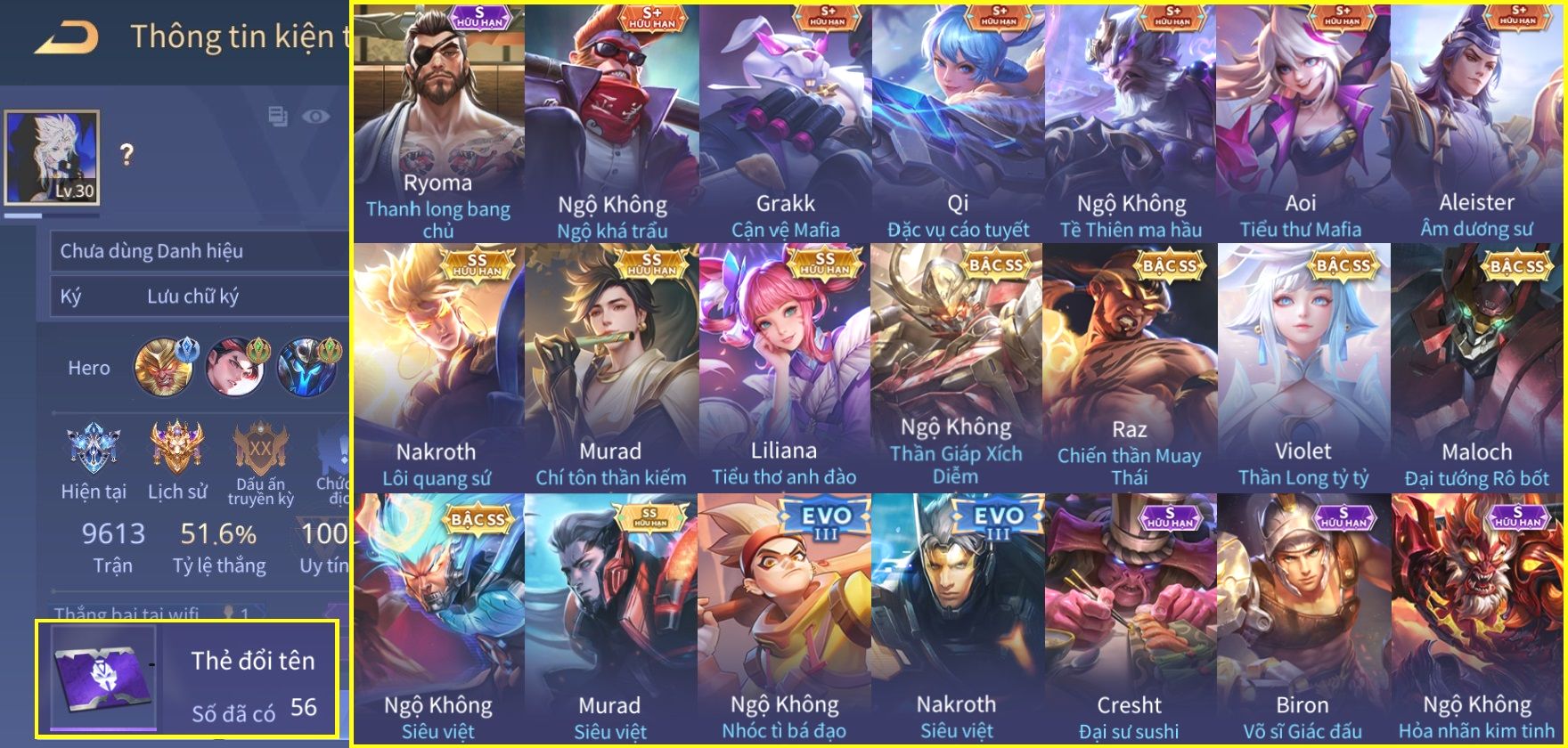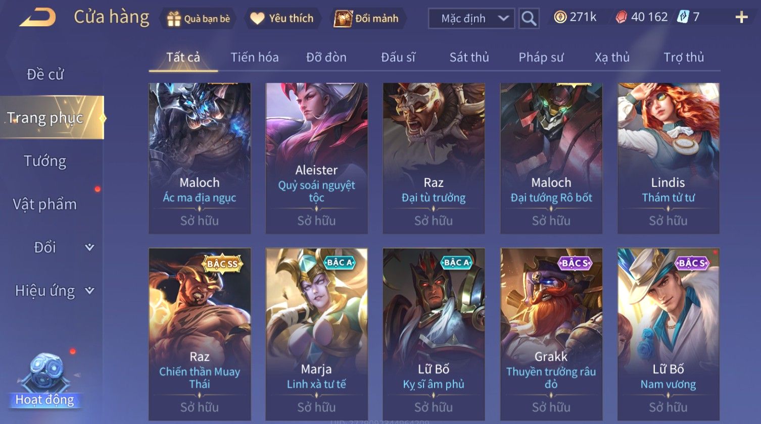 Nổi bật: Skin: Nakroth Lôi Quang Sứ×Murad Chí Tôn Thần Kiếm×Liliana Tiểu Thơ Anh Đào×Ngộ Không Thần Giáp Xích Diễm×Raz Chiến Thần Muay Thái×Violet Thần Long Tỷ Tỷ×Maloch Đại Tướng Rô Bốt×Ryoma Thanh Long Bang Chủ×Cresht Đại Sư Sushi×Full Ngọc, Nhiều Skin SS Đẹp
